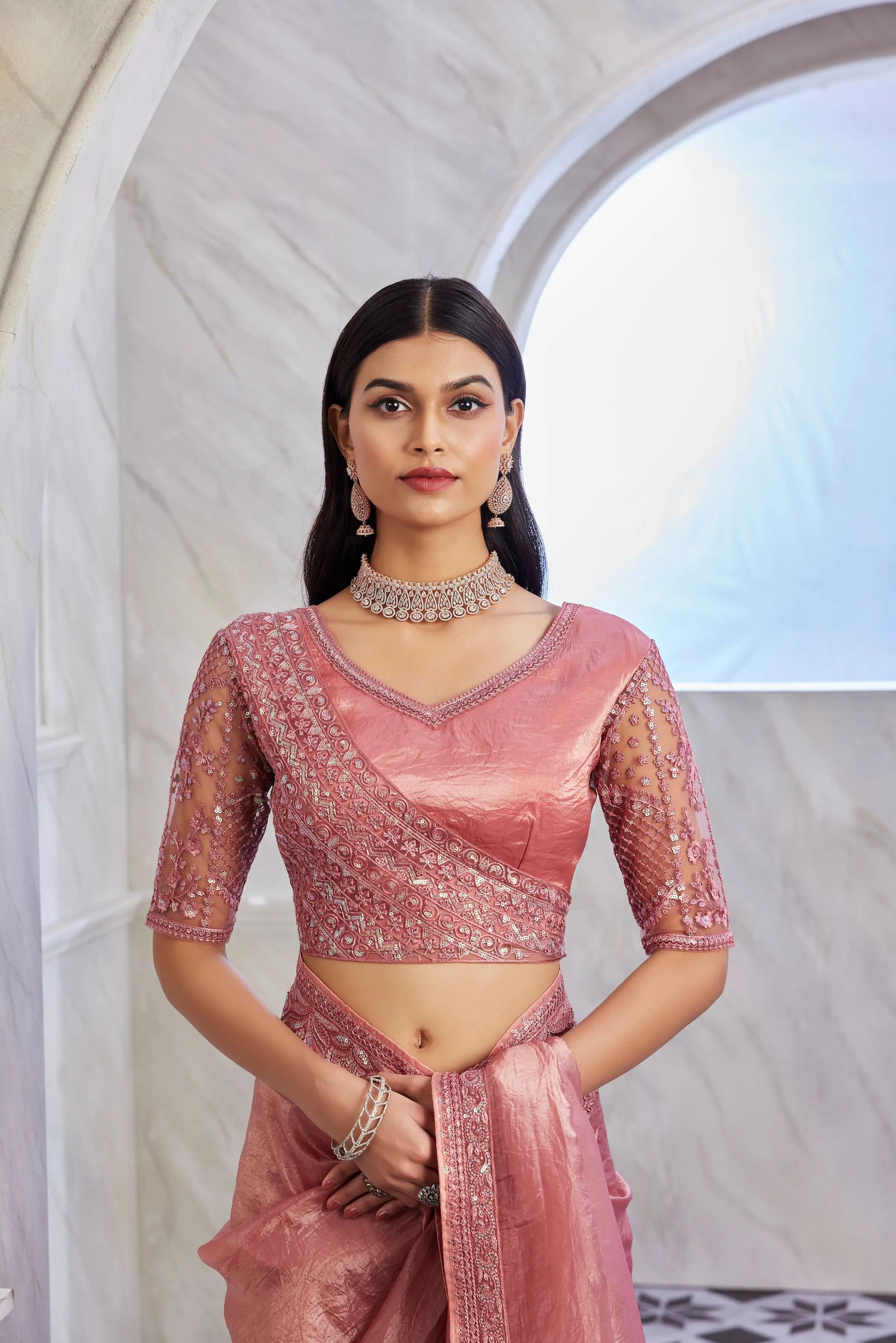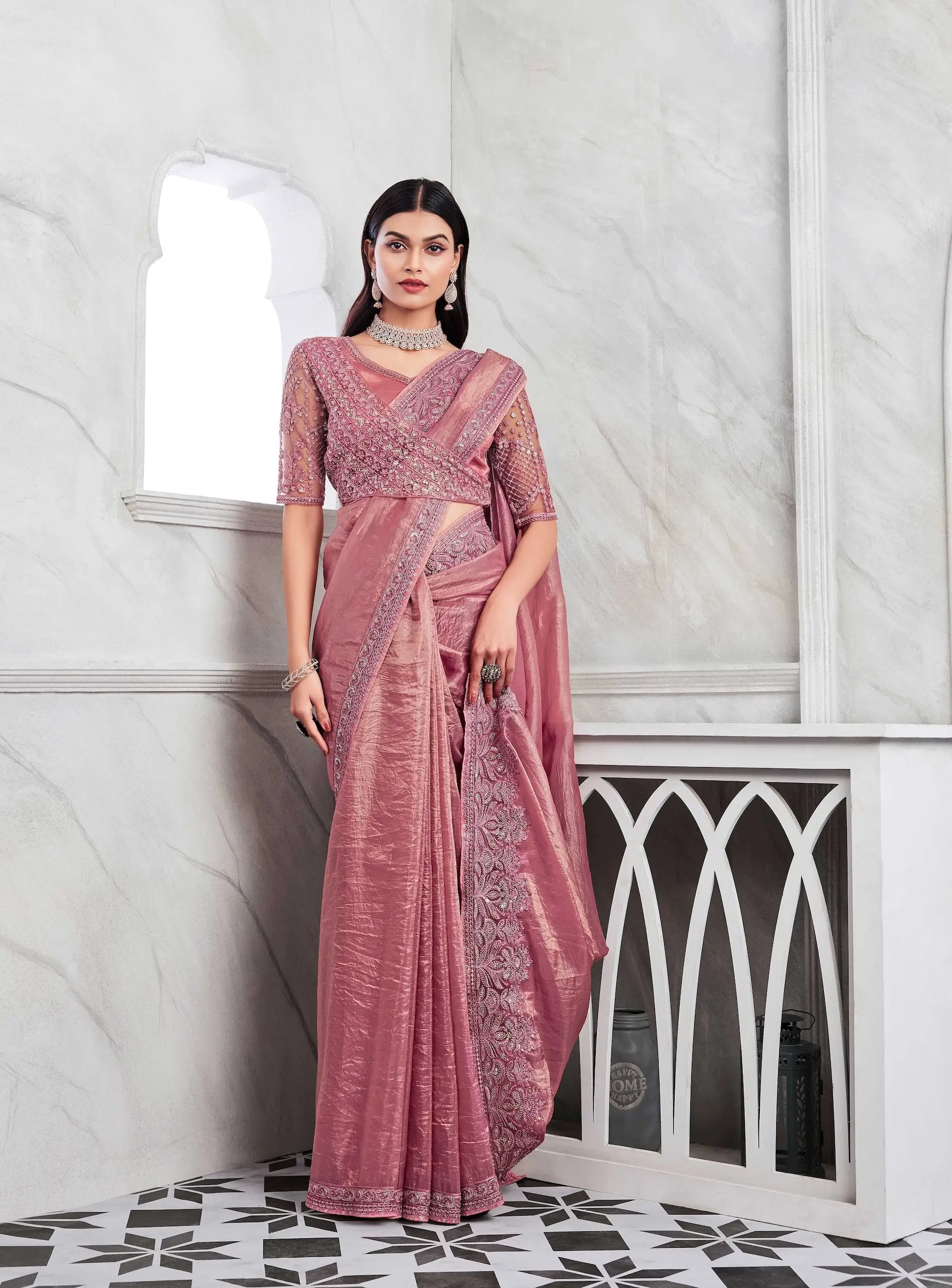 Pink Sim-Sim Silk Saree With Embroidery Work Blouse