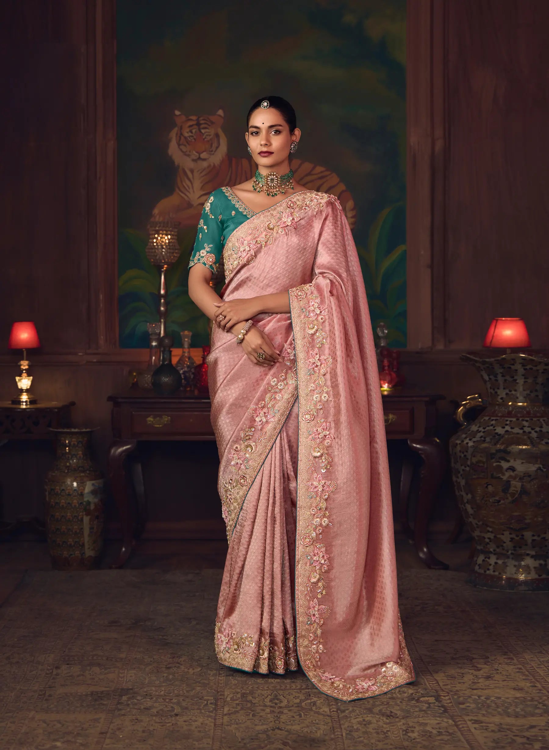 Flamingo Pink Heavy Embroidery & Handwork Silk Saree
