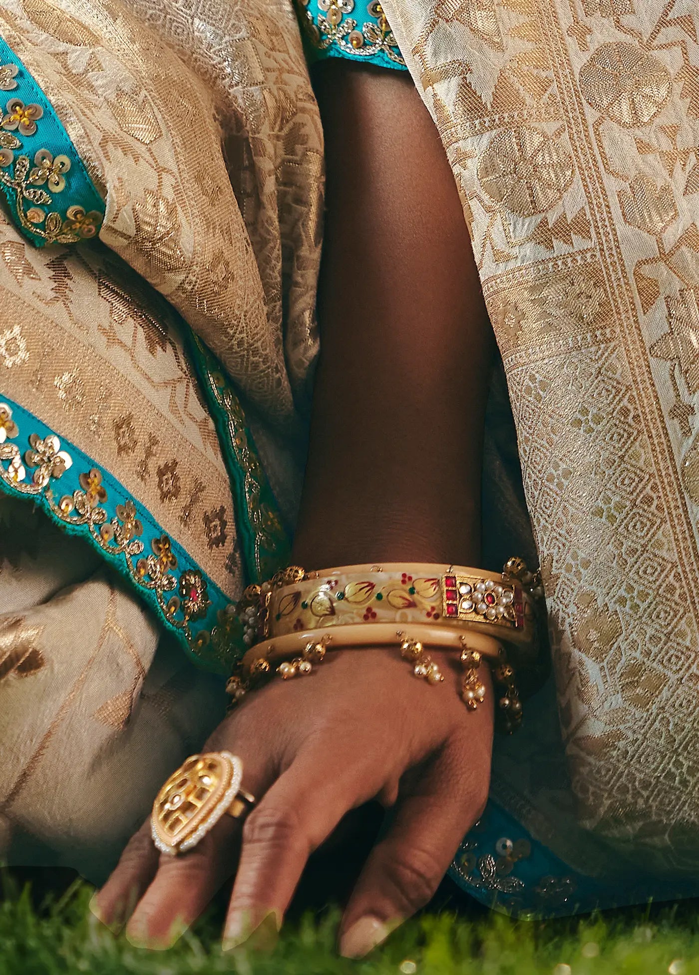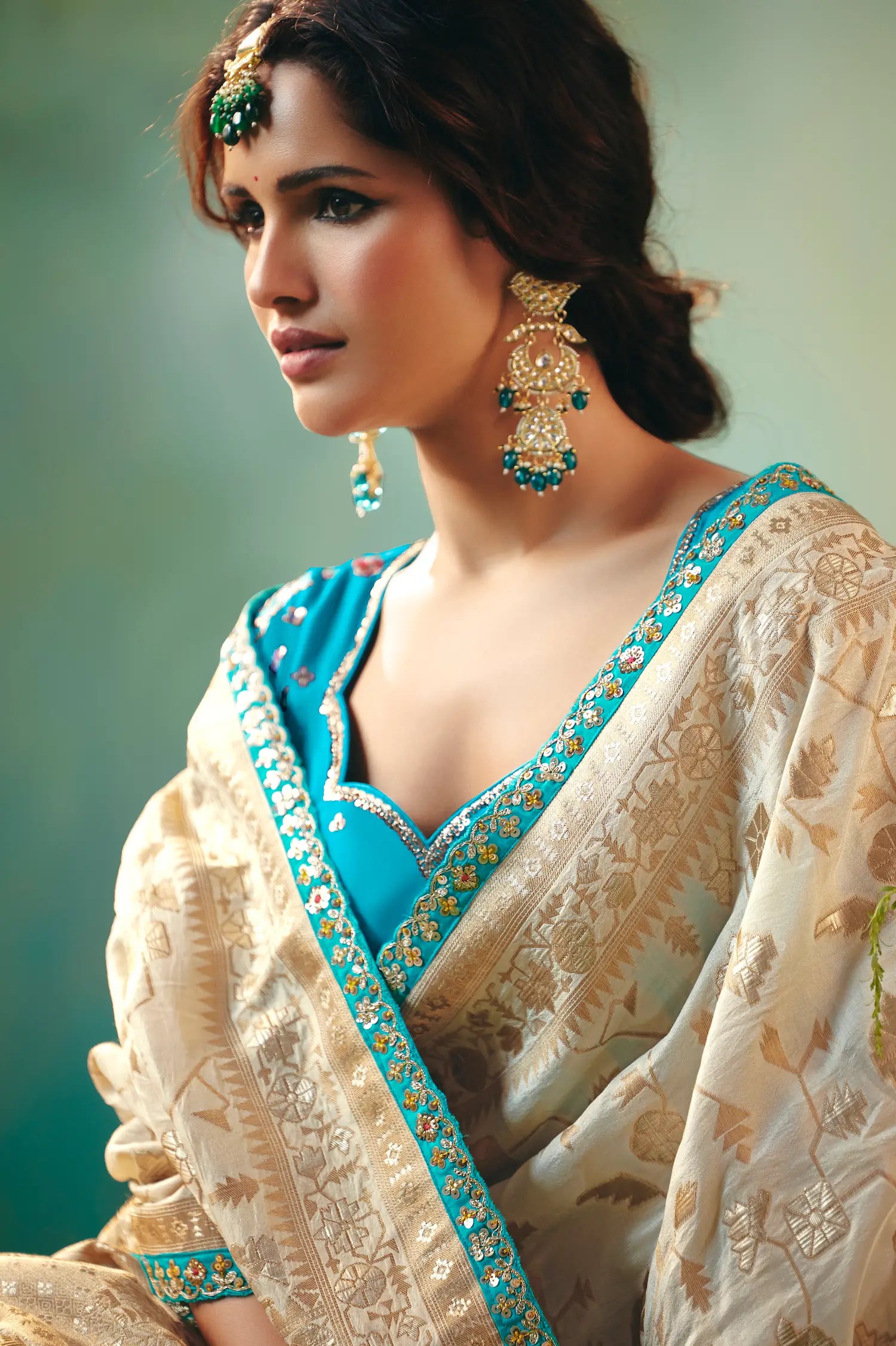 This antique white viscose dola silk saree features exquisite zari weaving with thread and sequins embroidery cutwork border. Paired with a dark cyan silk blouse adorned with matching embroidery, it radiates festive elegance and charm.