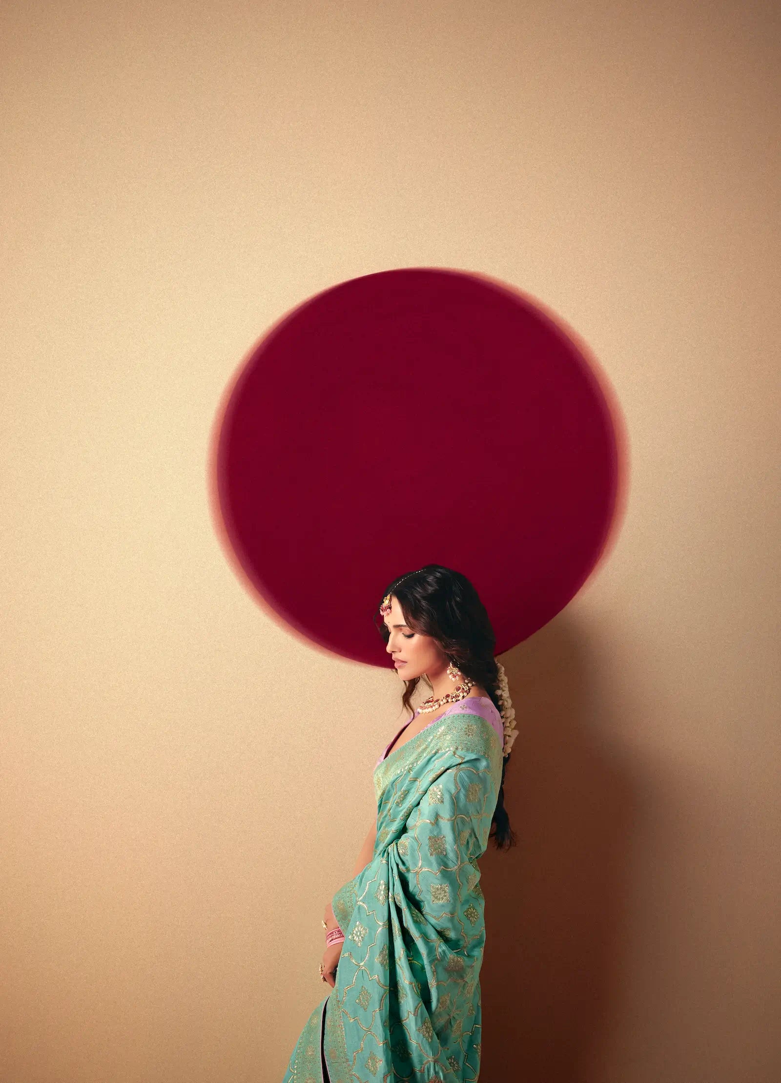 Graceful aqua blue bemberg viscose saree is adorned with elegant zari weaving, with piping border and tassels for a refined finish. Paired with a lavender pink blouse, it reflects timeless beauty and festive grace.