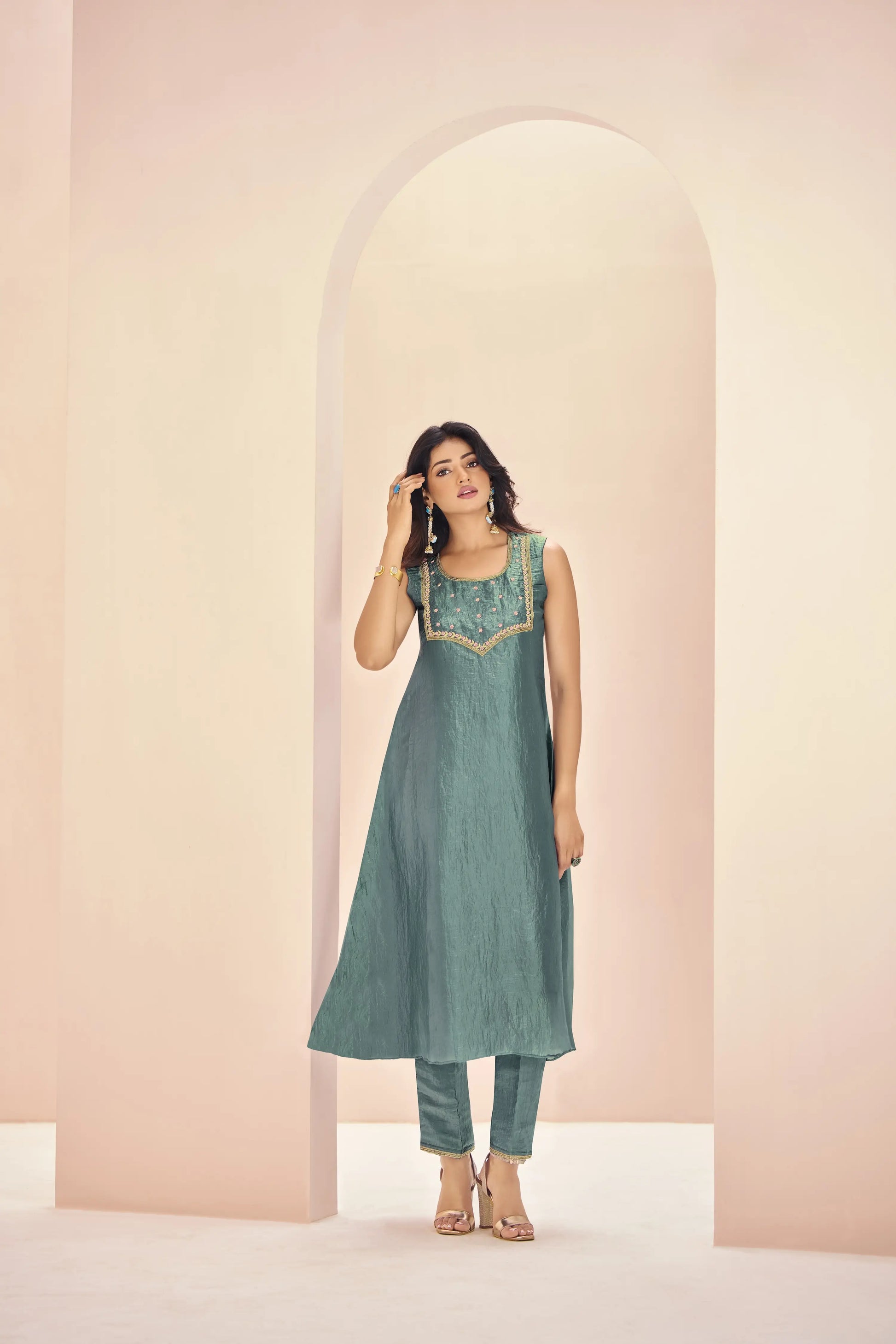 Celebrate the upcoming wedding season with this beautiful Pure Blooming Aqua Green Organza Fabric Straight Fit Kurta Set. The set includes a stylish kurta with matching trouser. Ready to wear, it’s the perfect choice for festive occasions, offering both elegance and comfort.