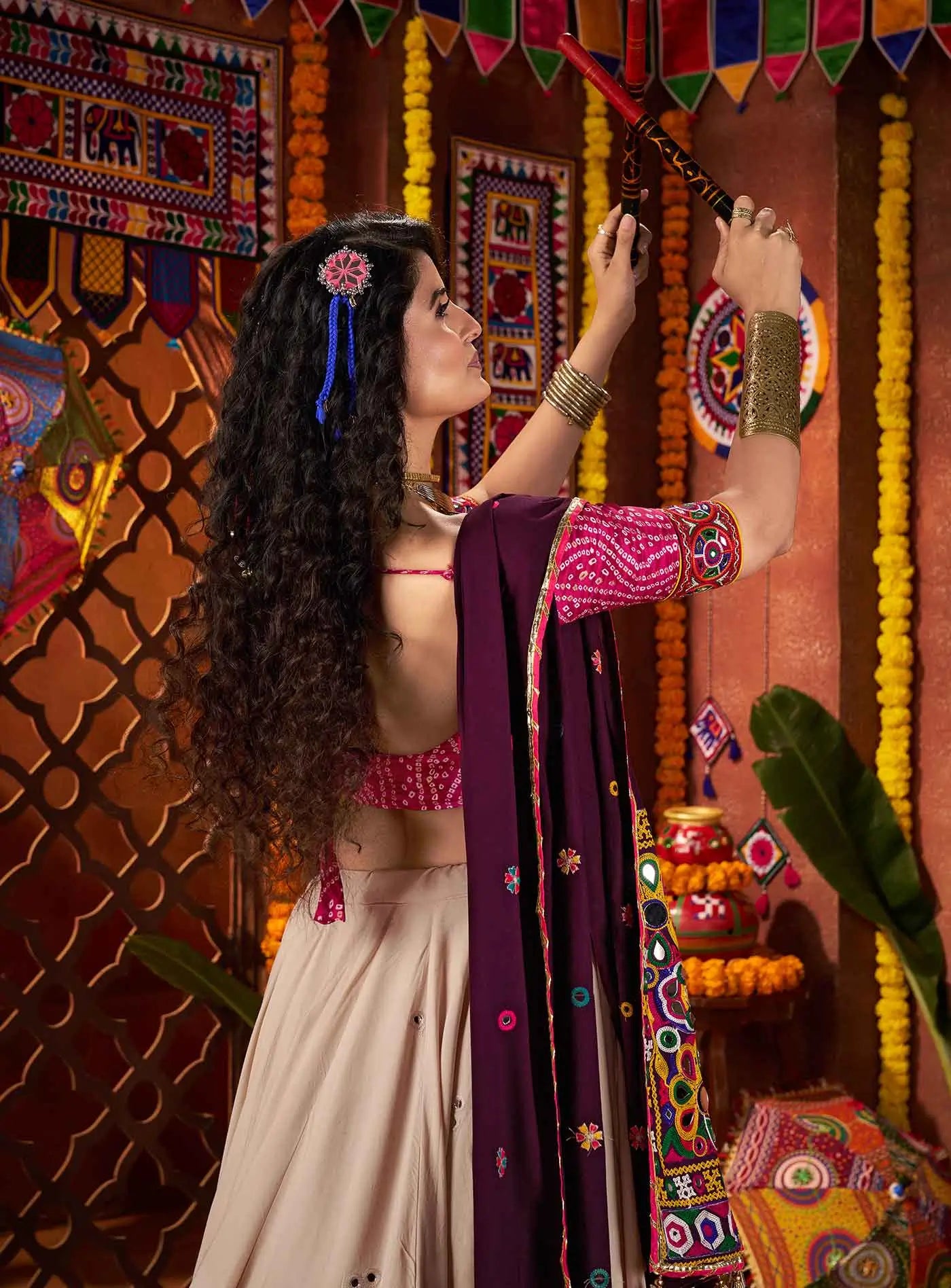 Beautiful Beige Thread And Mirror Work Designer Navratri Lehenga Choli