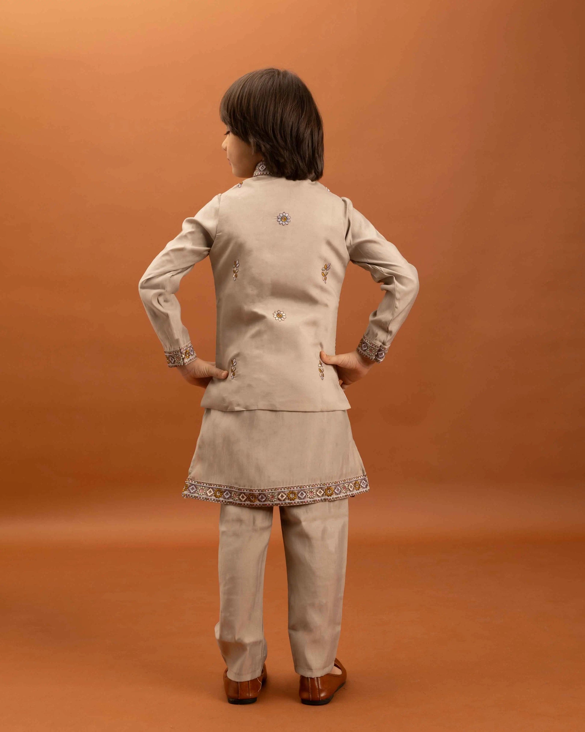 Presenting our new kid’s wear collection in premium viscose silk. The jacket and kurta features intricate thread sequins embroidery. Paired with matching pant--Perfect for weddings, cultural events, parties, and musical nights, this outfit exudes timeless elegance.