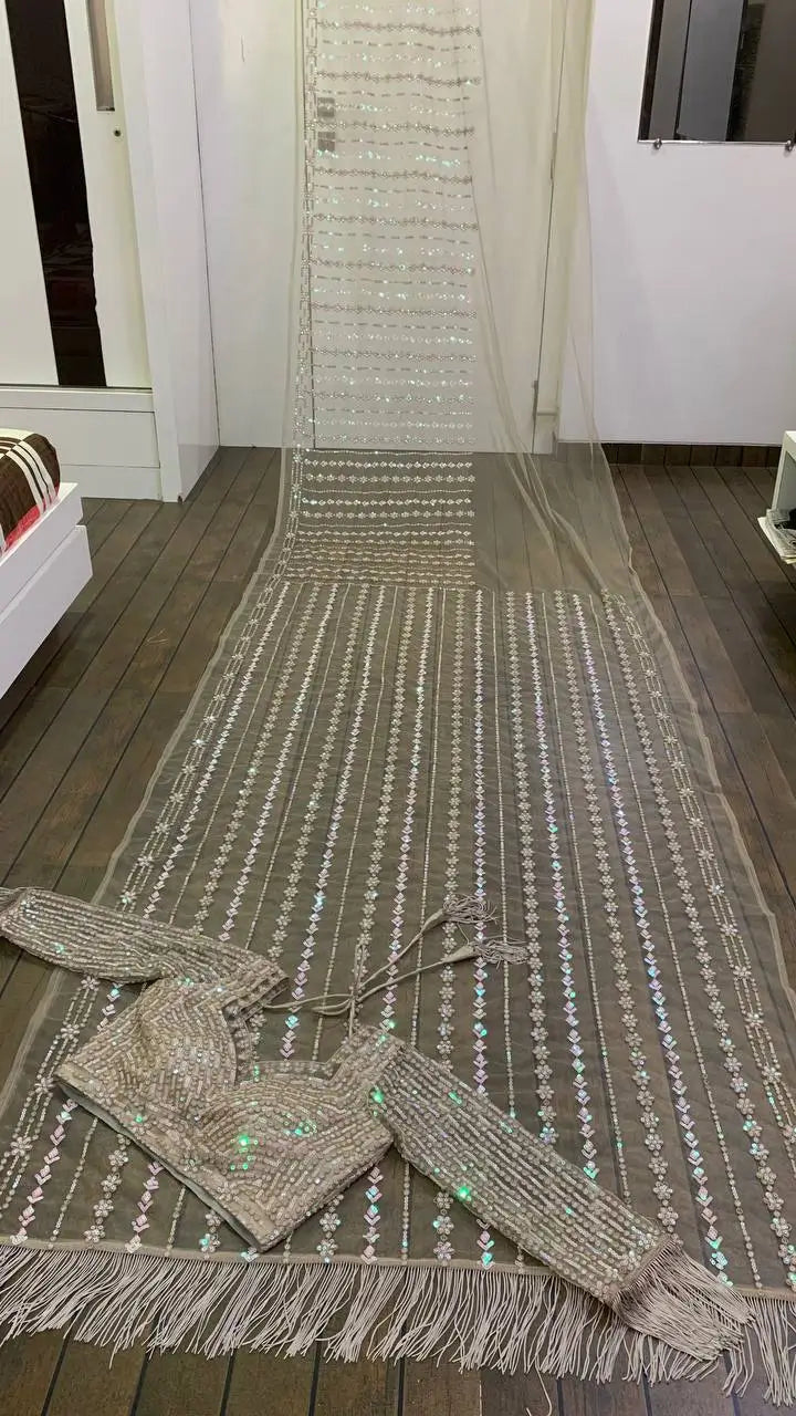 Turn heads with this dazzling net saree, adorned in stunning sequence & thread work that adds a vibrant yet elegant shimmer to your silhouette. The subtle border piping frames the saree beautifully, offering a neat and graceful finish. Paired with a matching net blouse featuring the same detailing, this ensemble is perfect for cocktail parties, festive nights, or sangeet celebrations where you want to sparkle with every step.
