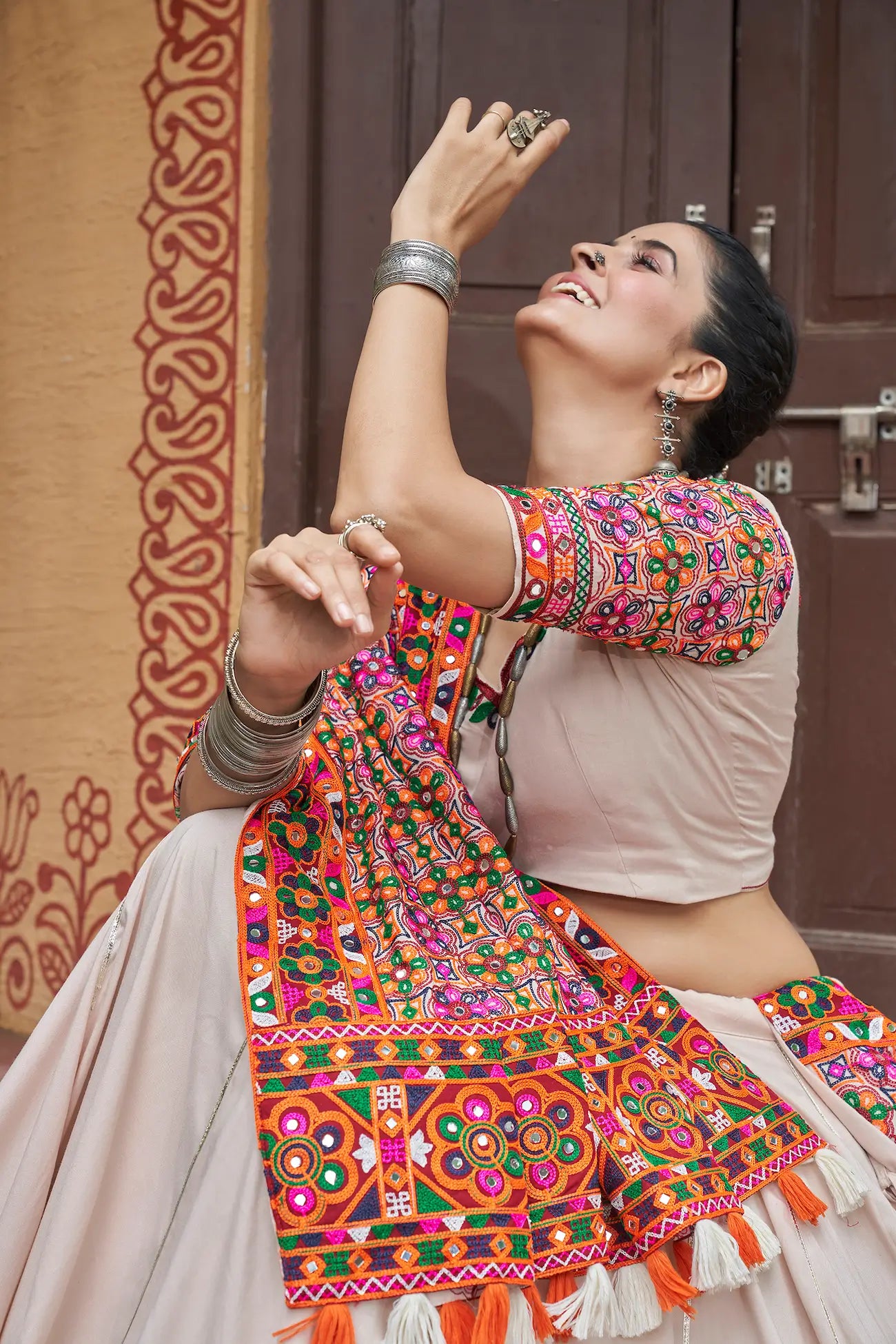 Beige Viscose Rayon Navratri Lehenga Choli With Thread Embroidery & Mirror Work