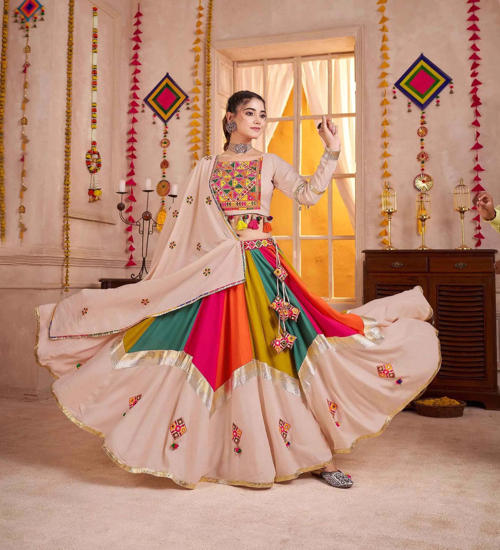 Beige With Multi Color Thread Mirror Work Lehenga Choli For Navratri