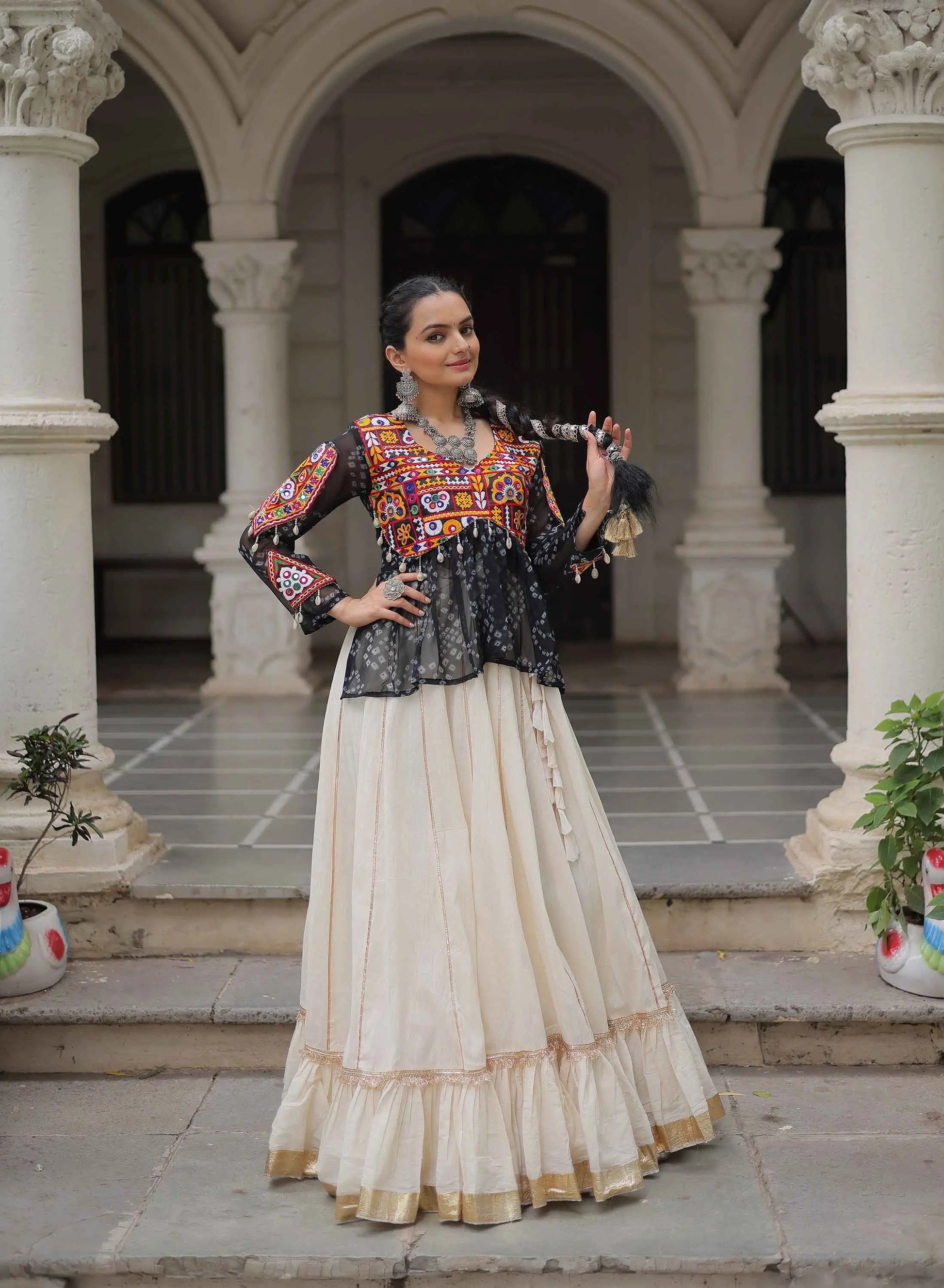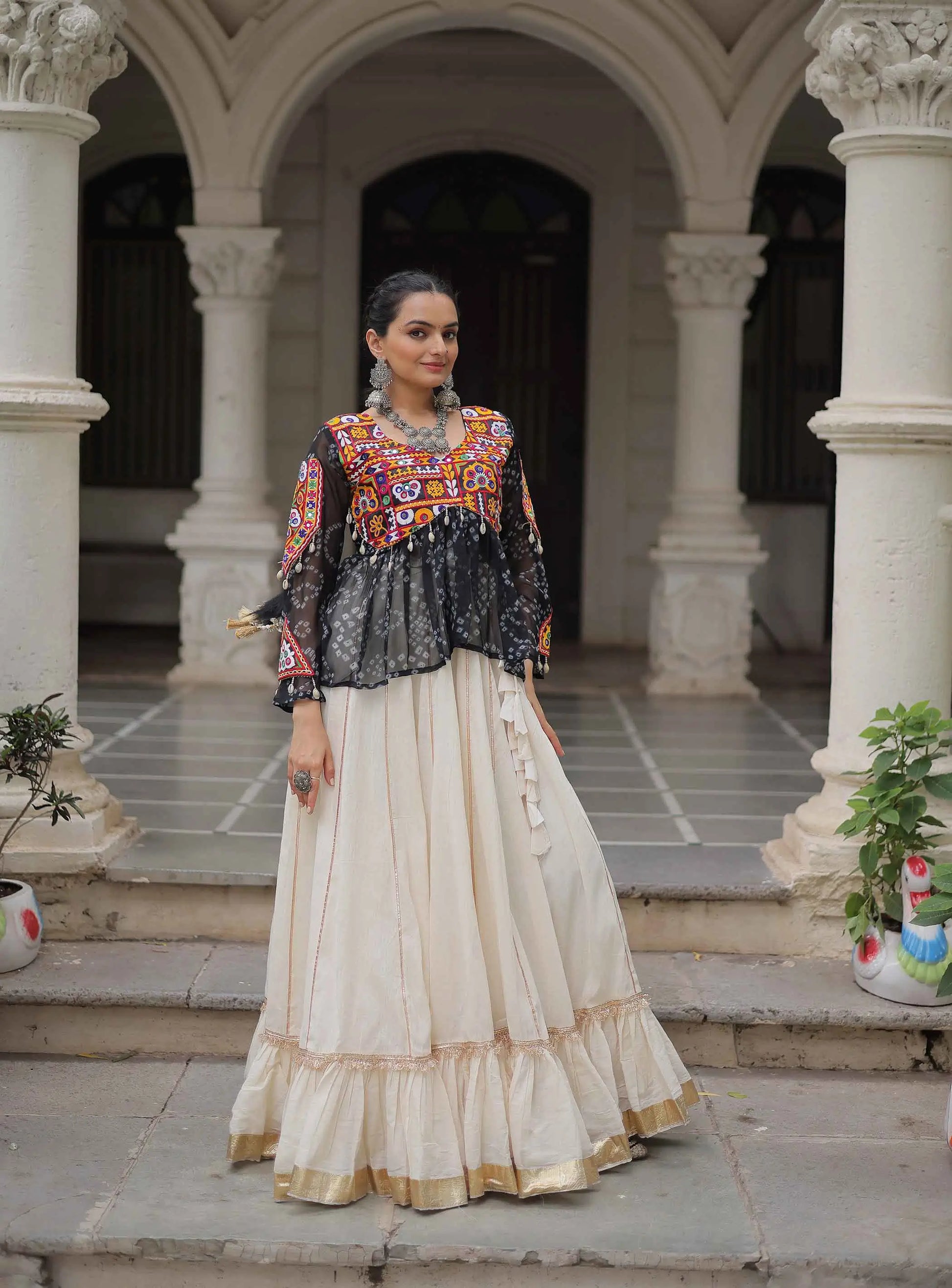 Introducing our new Navratri lehenga in rich cotton fabric, featuring attractive lace work. Paired with blouse showcasing vibrant print and Kutchi Gamthi embroidery, it's a perfect pick for festive Garba nights and traditional celebrations.