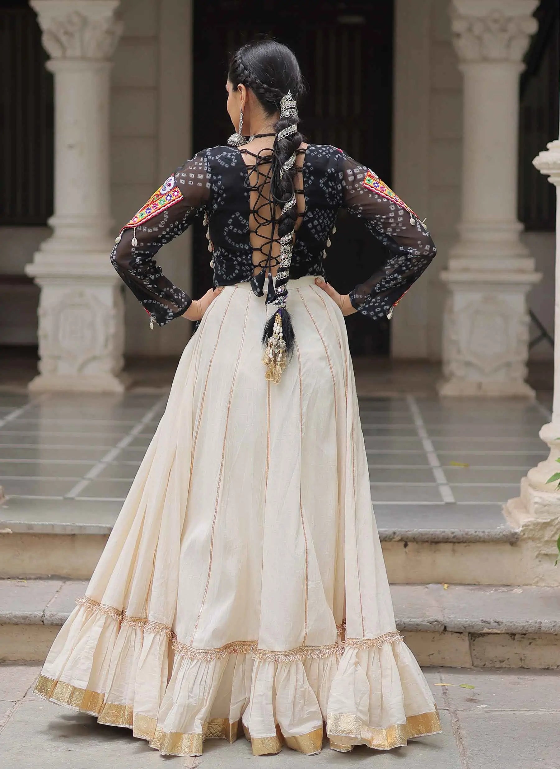 Black Bandhani Print Gamthi Work Blouse With Lace Work Navratri Lehenga