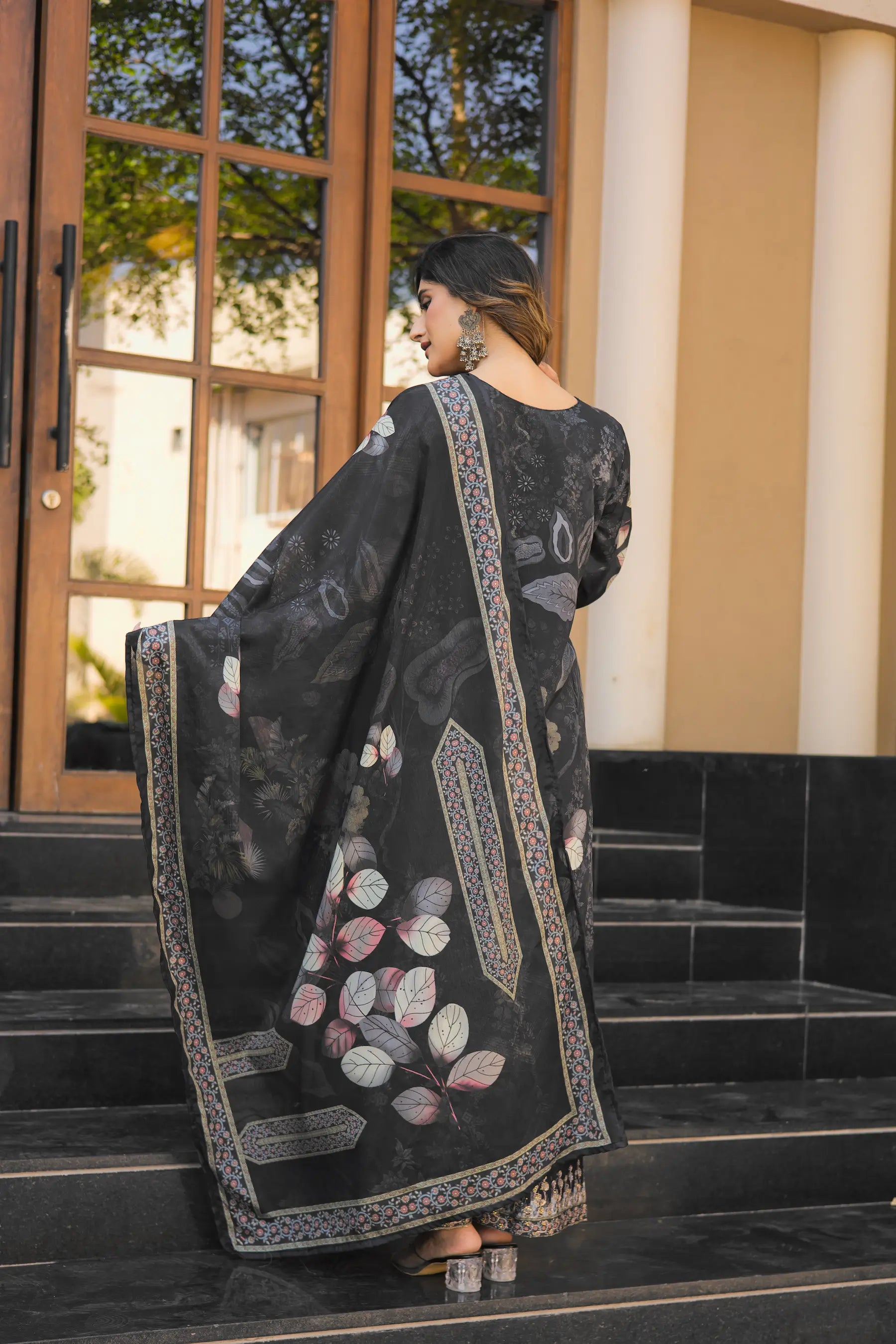 Elegant black chinon salwar suit featuring digital print with delicate hand work on top and bottom. Comes with a matching dupatta for a graceful festive look.