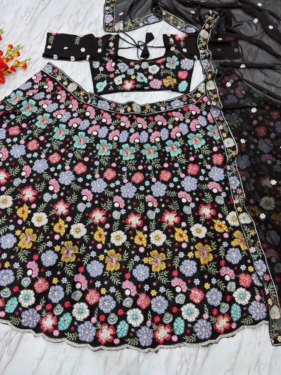 Black Georgette Multi Thread Sequins Floral Embroidery Work Lehenga