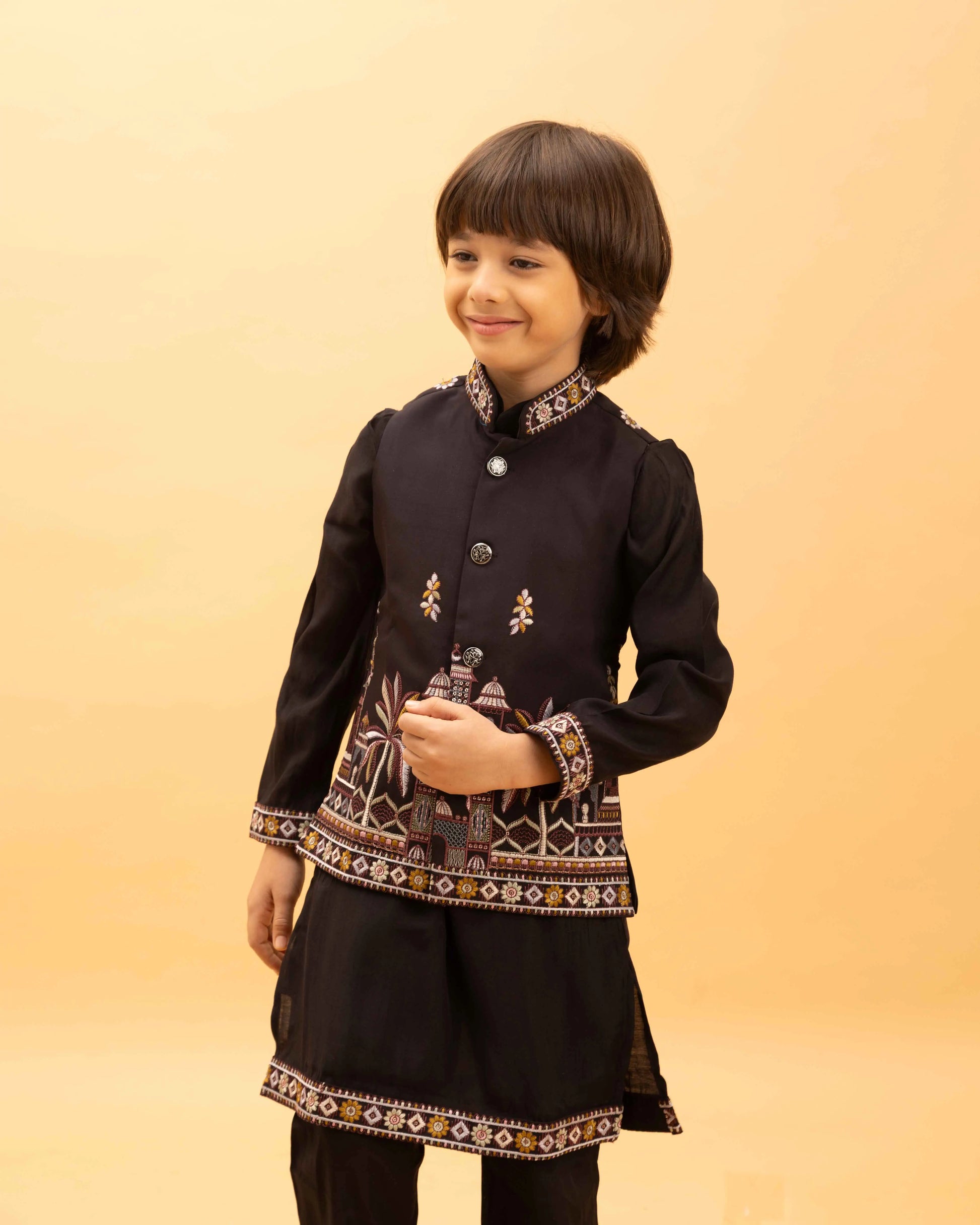 Presenting our new kid’s wear collection in premium viscose silk. The jacket and kurta features intricate thread sequins embroidery. Paired with matching pant--Perfect for weddings, cultural events, parties, and musical nights, this outfit exudes timeless elegance.
