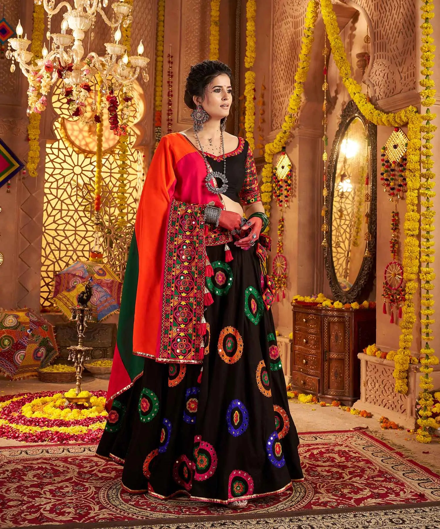 Black Navratri Lehenga With Embroidery & Mirror Work And Colorful Dupatta