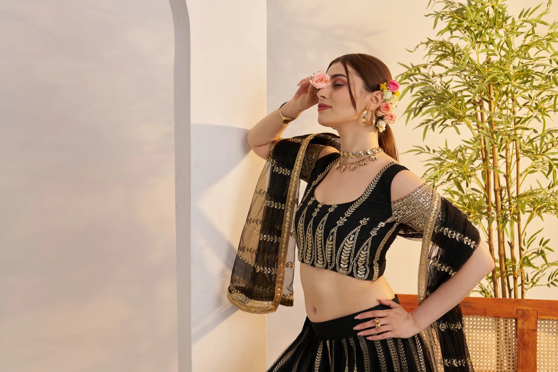 This black lehenga in soft net is adorned with delicate cotton thread work and sequins embroidery for a rich look. Paired with a matching blouse and dupatta with lace touch up, it creates a graceful and stylish ensemble.