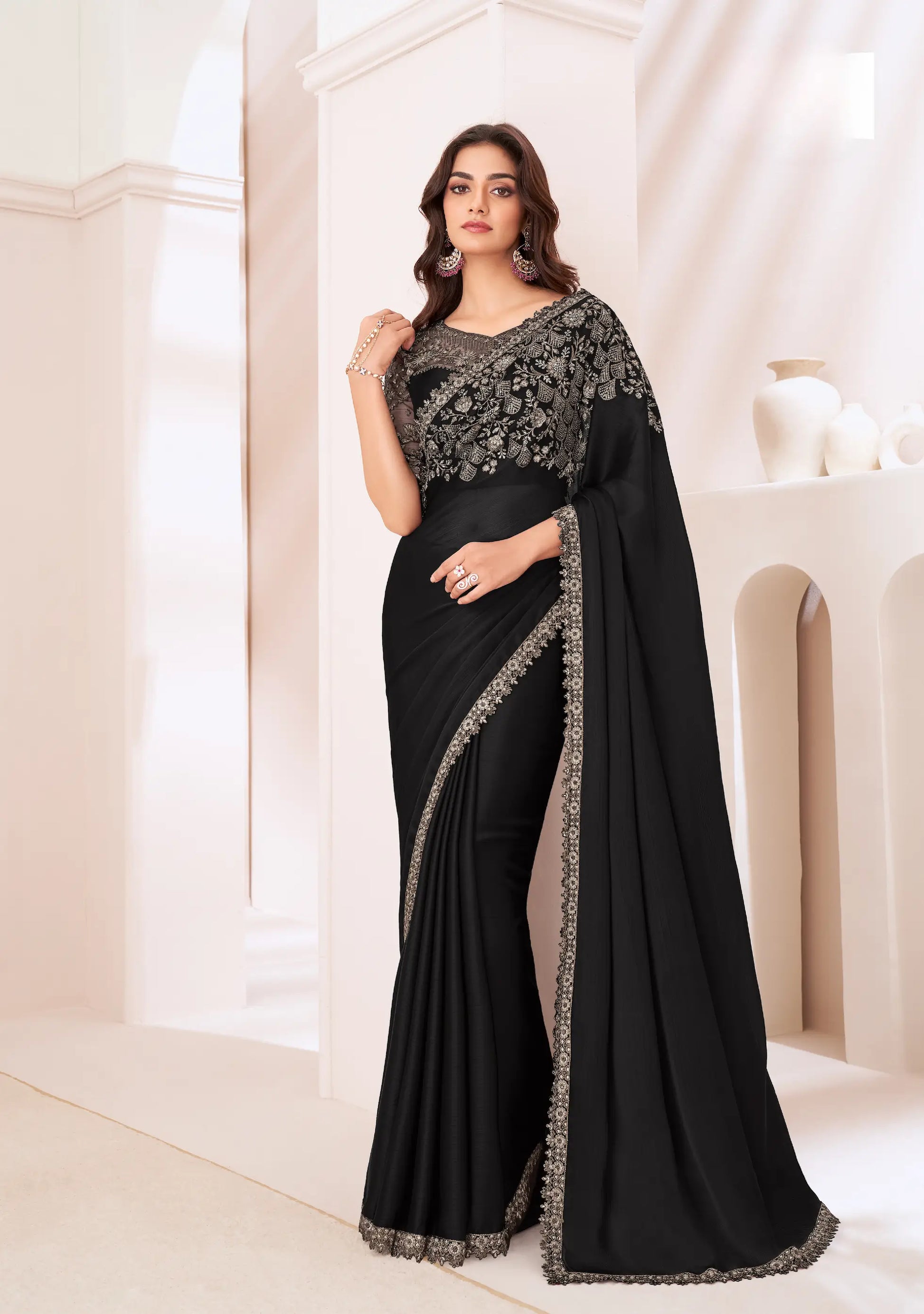 Black Satin Chiffon Party Wear Saree With Sequence & Thread Embroidery Work