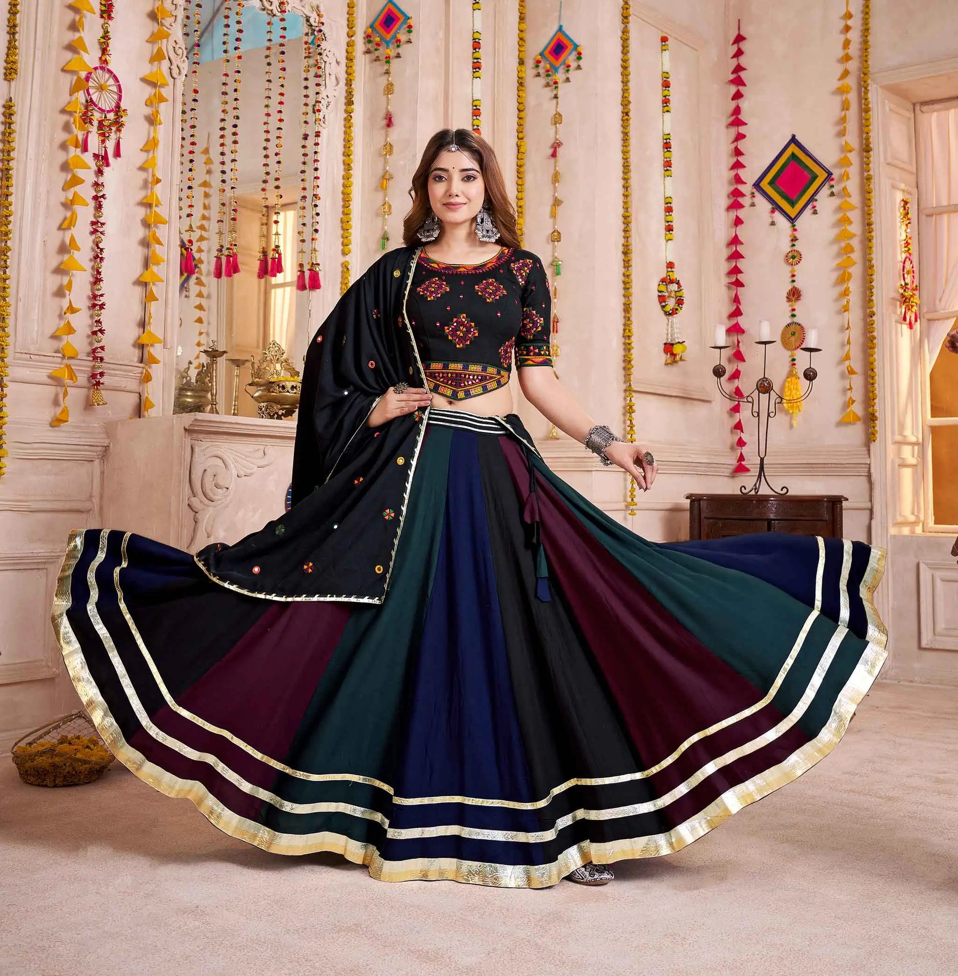Step into Navratri with our stunning viscose cotton lehenga, adorned with vibrant multi-color designs and lampi borders. The blouse intricate thread and hand mirror work, while the dupatta with mirrors and lace detailing. Perfect for every festive twirl!