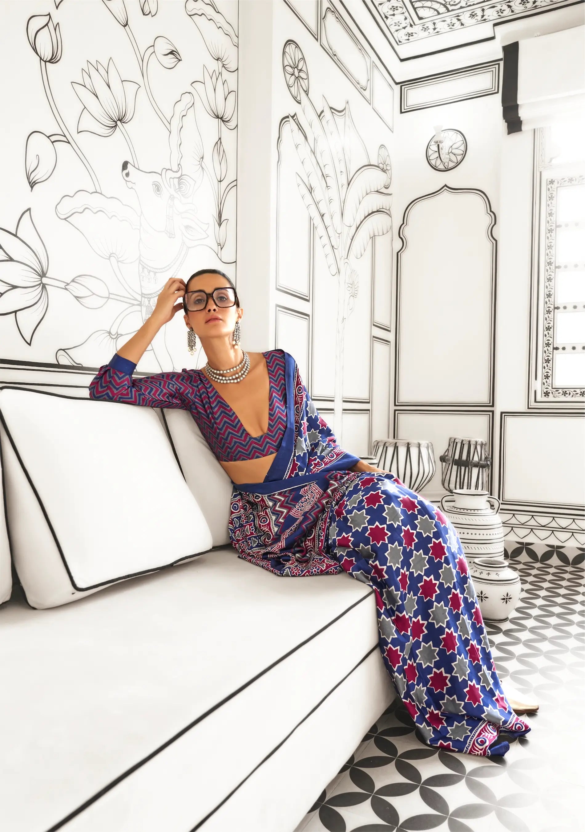 This elegant blue satin crepe saree features exquisite Ajrakh print. Paired with a multicolor blouse in matching print, it creates a striking contrast perfect for festive celebrations and cultural gatherings.