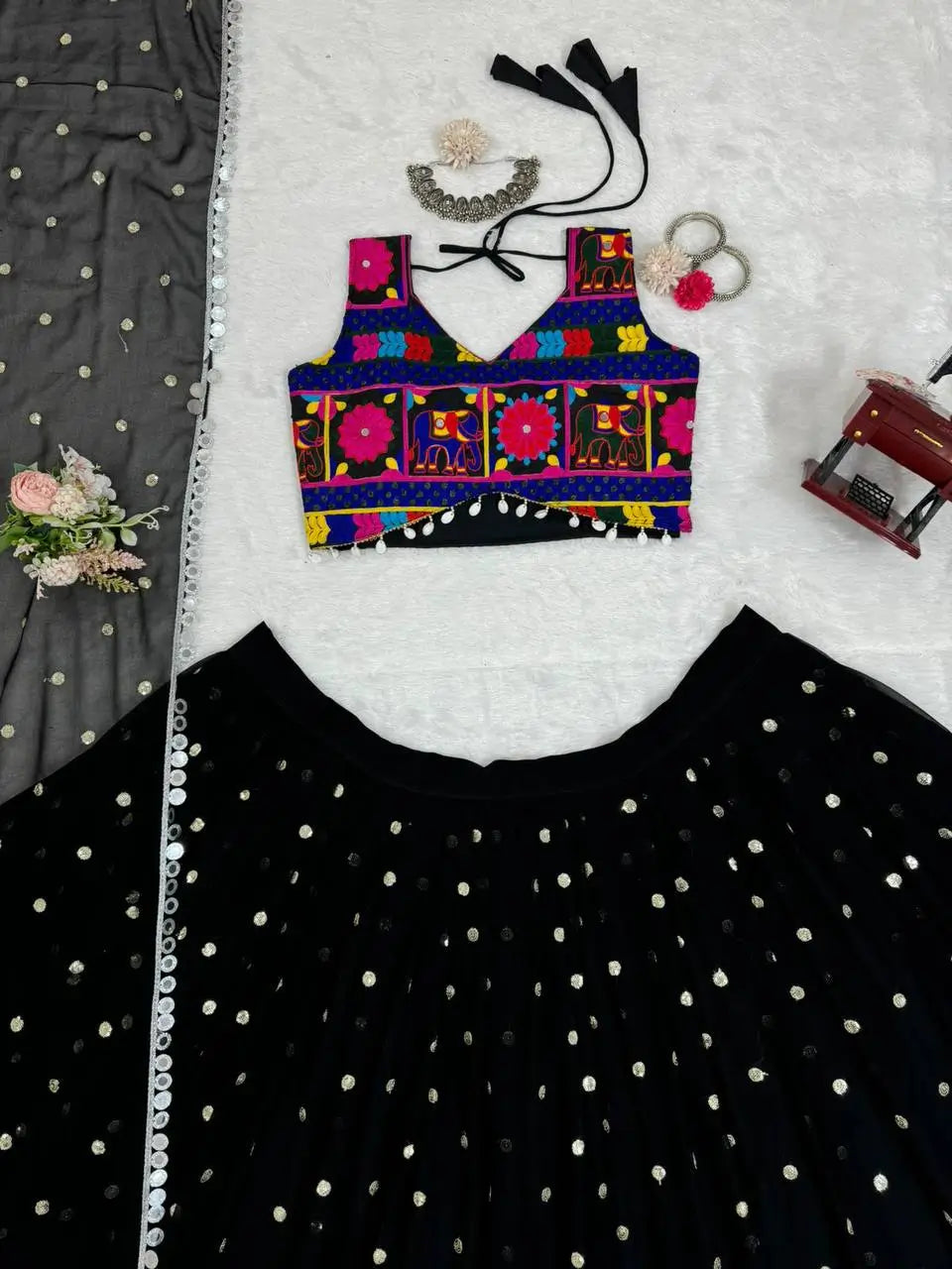 Bold In Black Chain Stitch Embroidery & Mirror Work Georgette Navratri Lehenga