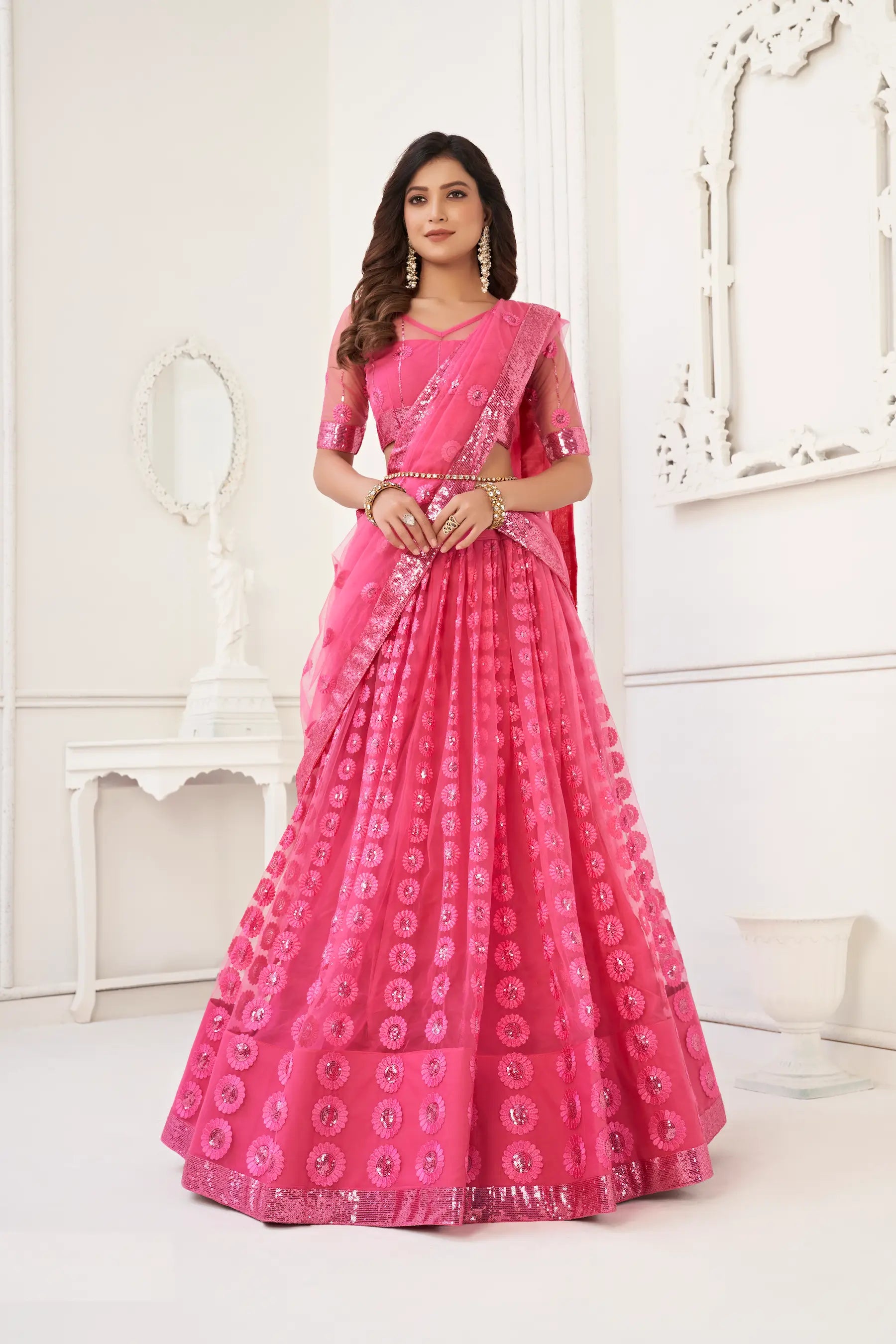 Bright Pink Net Lehenga Choli With Cotton Thread Work & Sequence Embroidery Work