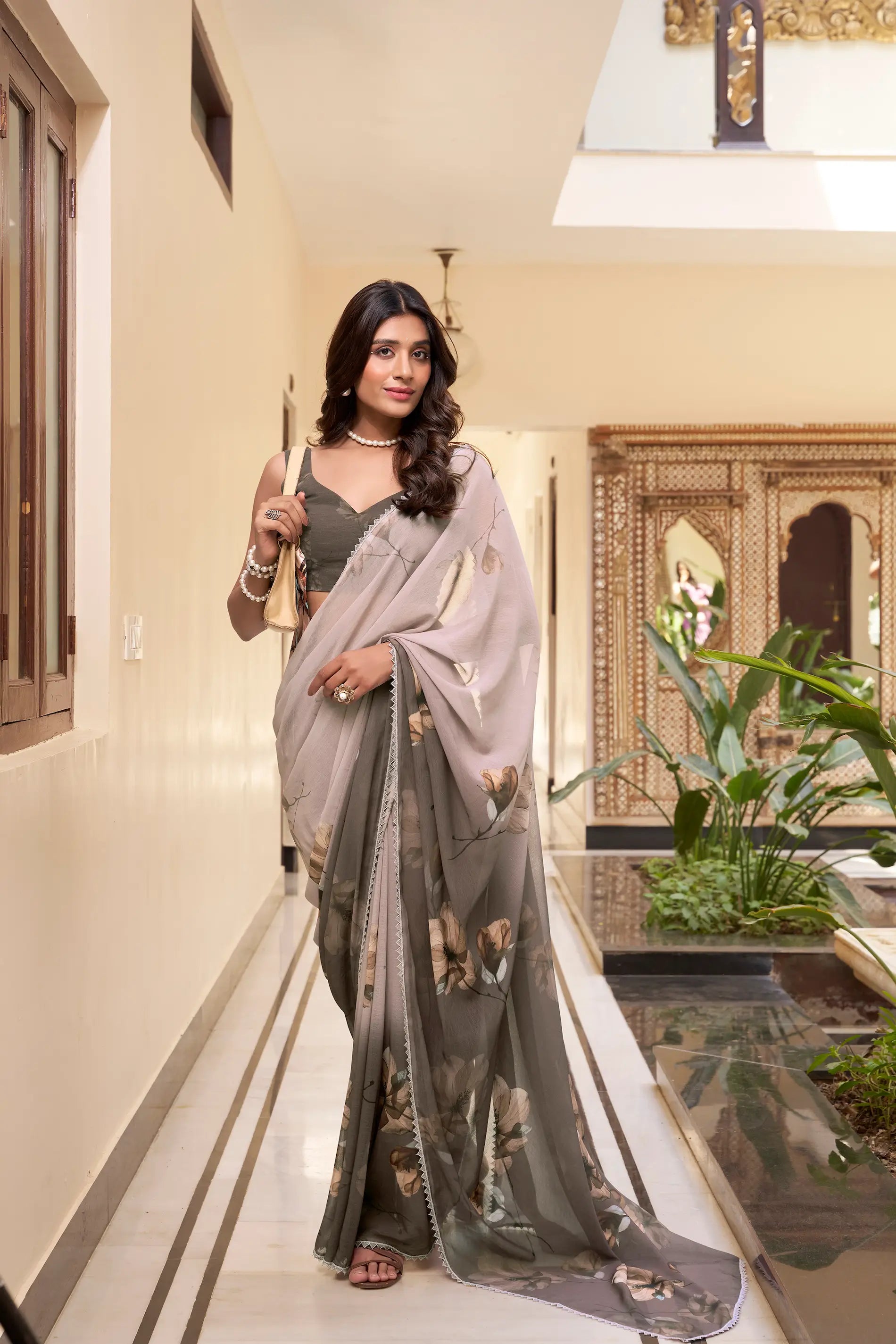 Elegant Weightless Marbal saree featuring soft floral prints and a delicate lace border. Paired with a matching blouse for a graceful, feminine look.
