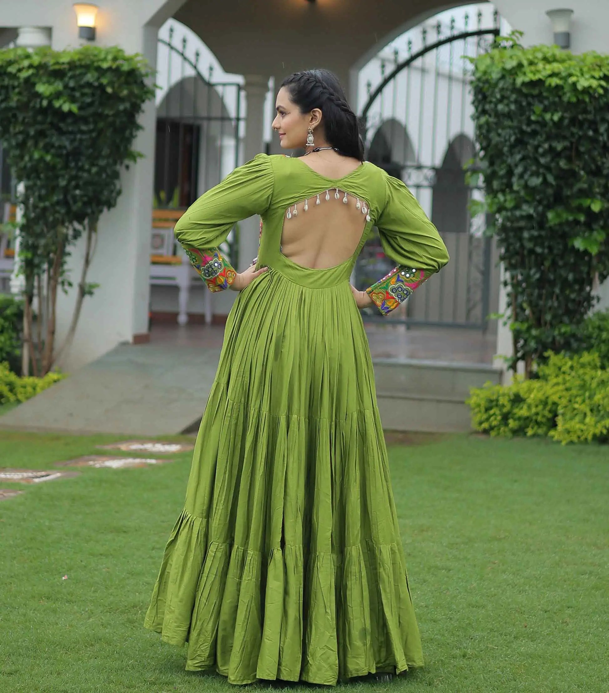 Camo Green Kutchi Gamthi Work Mirror Work Rayon Navratri Gown