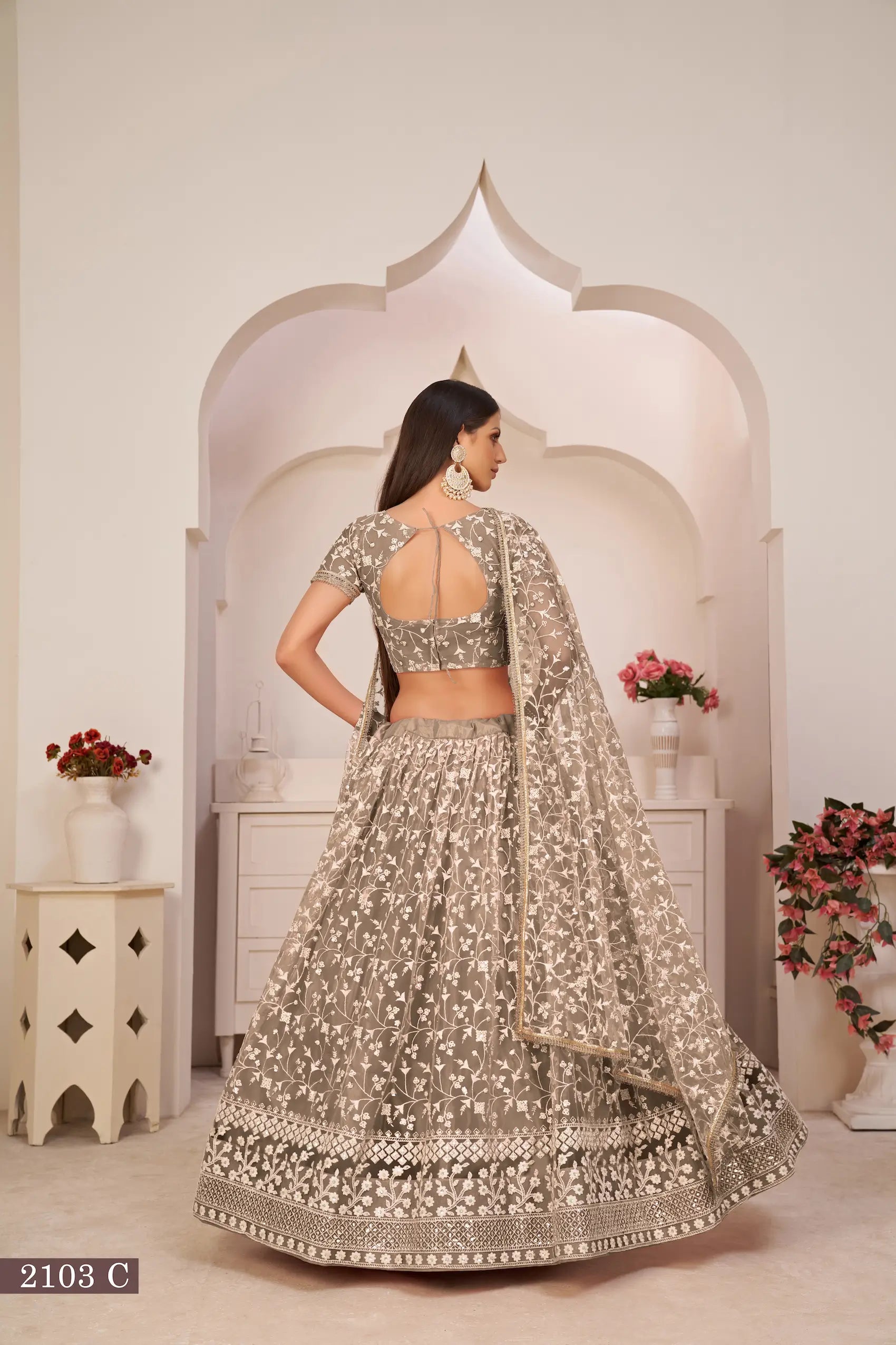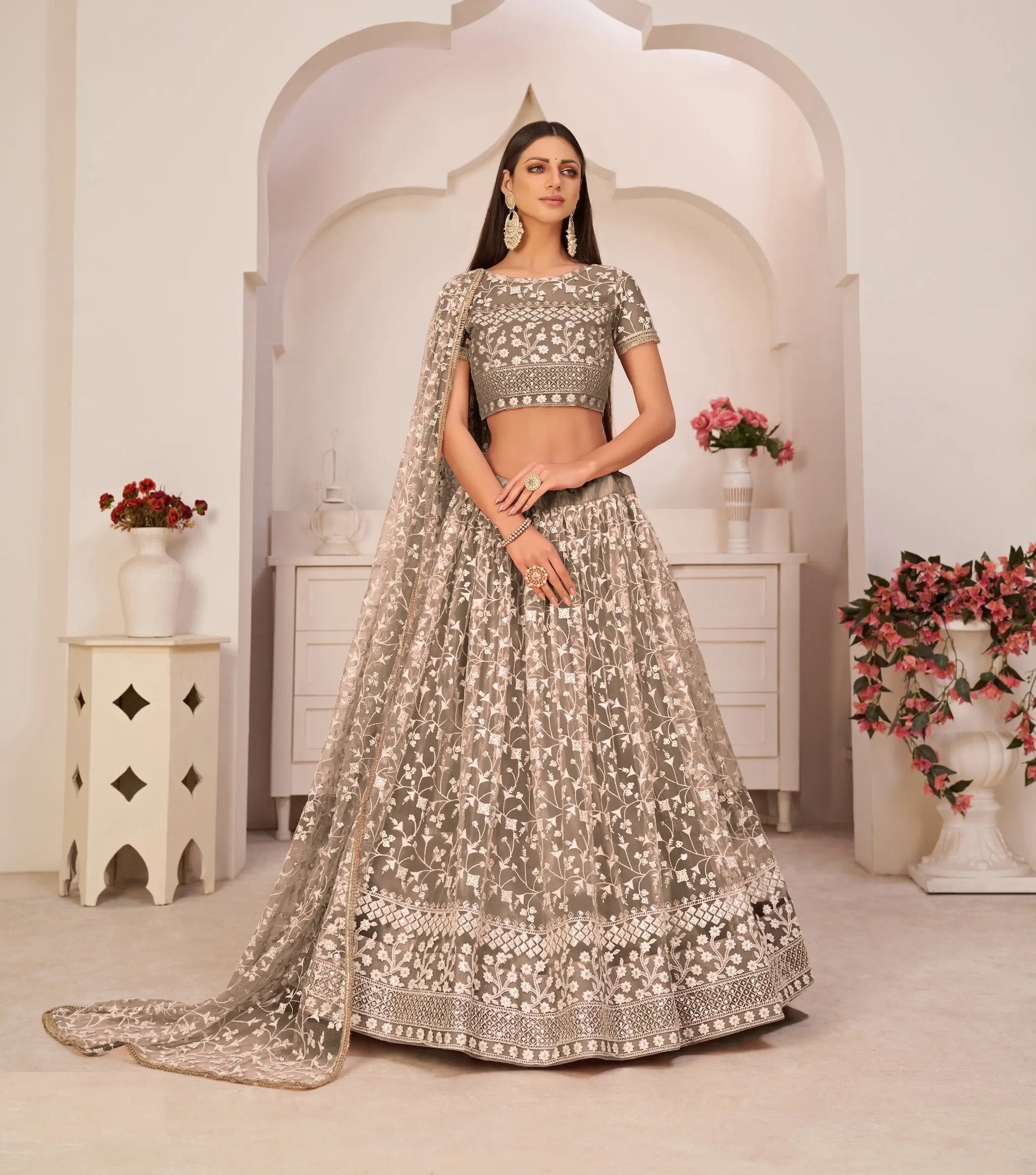 Chocolate Brown Net Lehenga Choli With White Cotton Thread Work, Zari Work & Sequence Work
