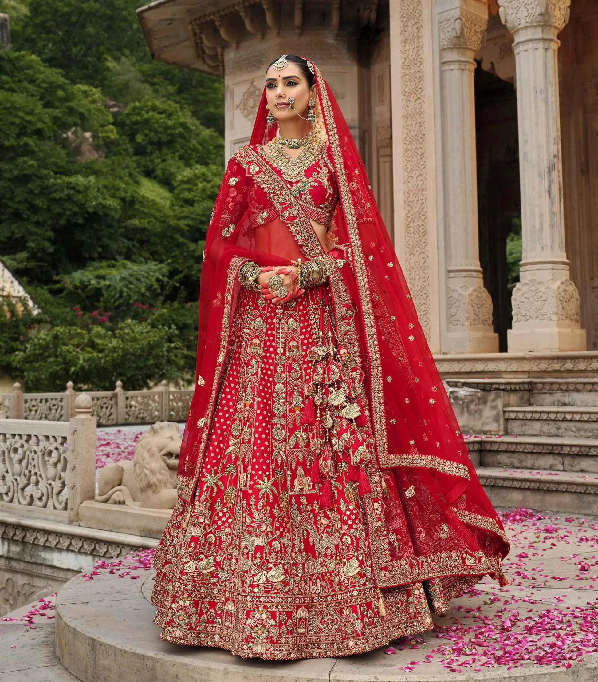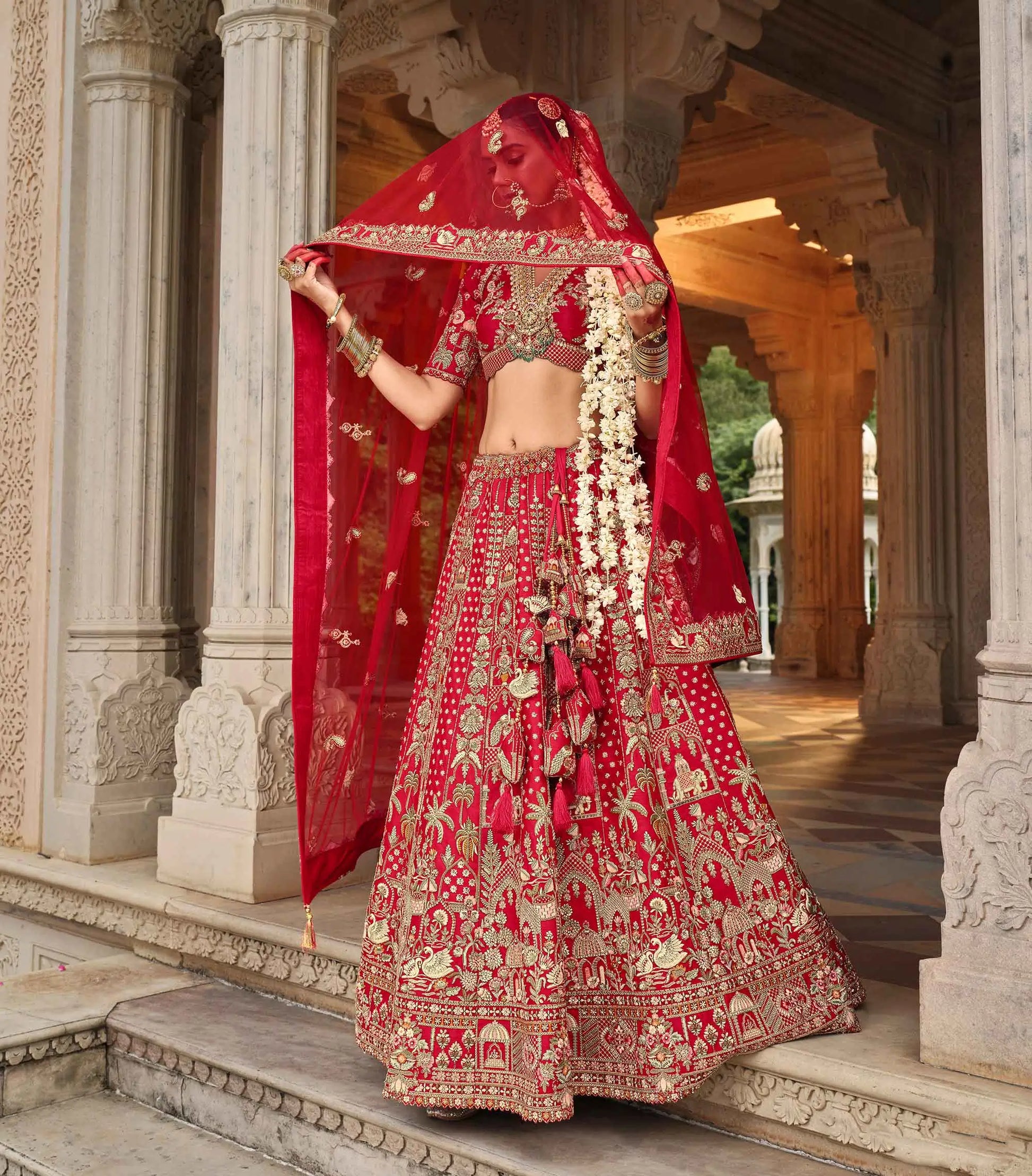Cornel Red Bridal Lehenga Khatli Embroidery & 2 Dupatta