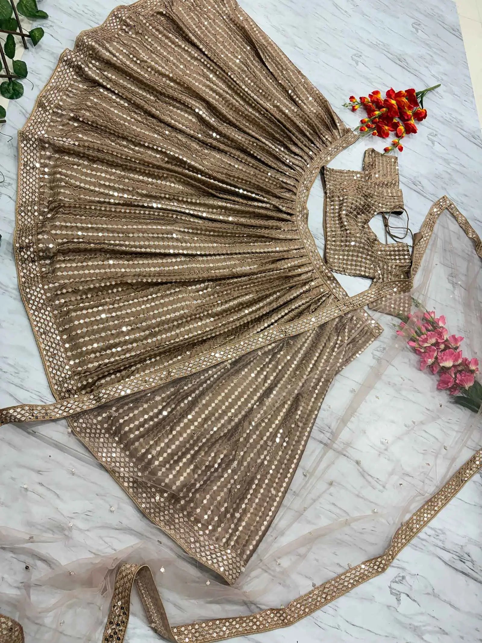 Dark Beige Silk Lehenga With Heavy Sequins zari Work With Dupatta