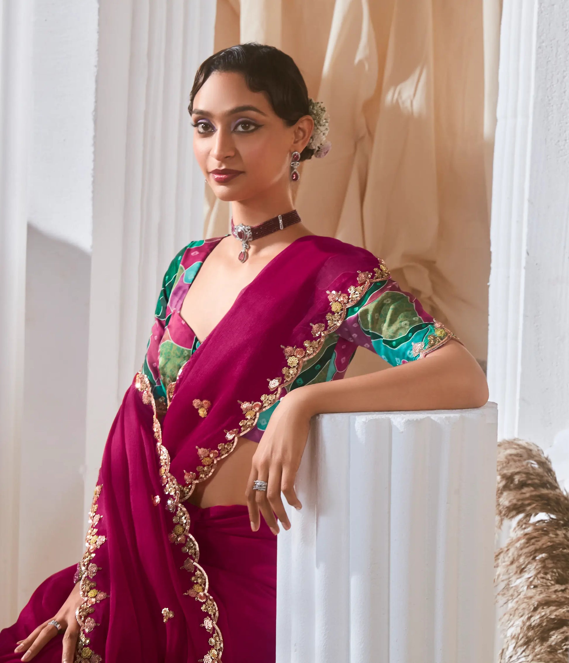 This elegant dark fuchsia fancy tissue saree adorned with thread & sequins embroidery, cut work border. Paired with matching blouse featuring digital print and embroidery, it makes a perfect choice for weddings and festive occasions.