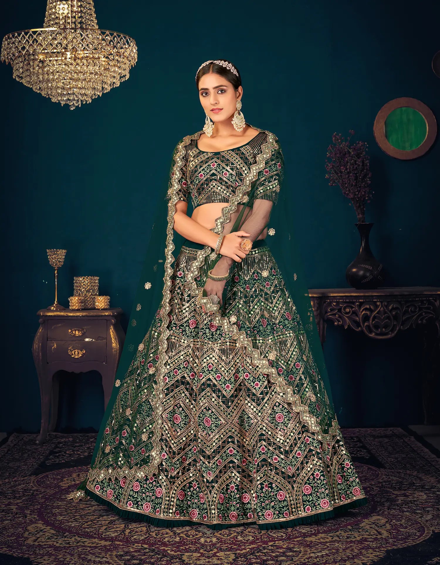 Dark Green Georgette Thread, Sequence & Gota Patti Embroidered Work Lehenga Choli