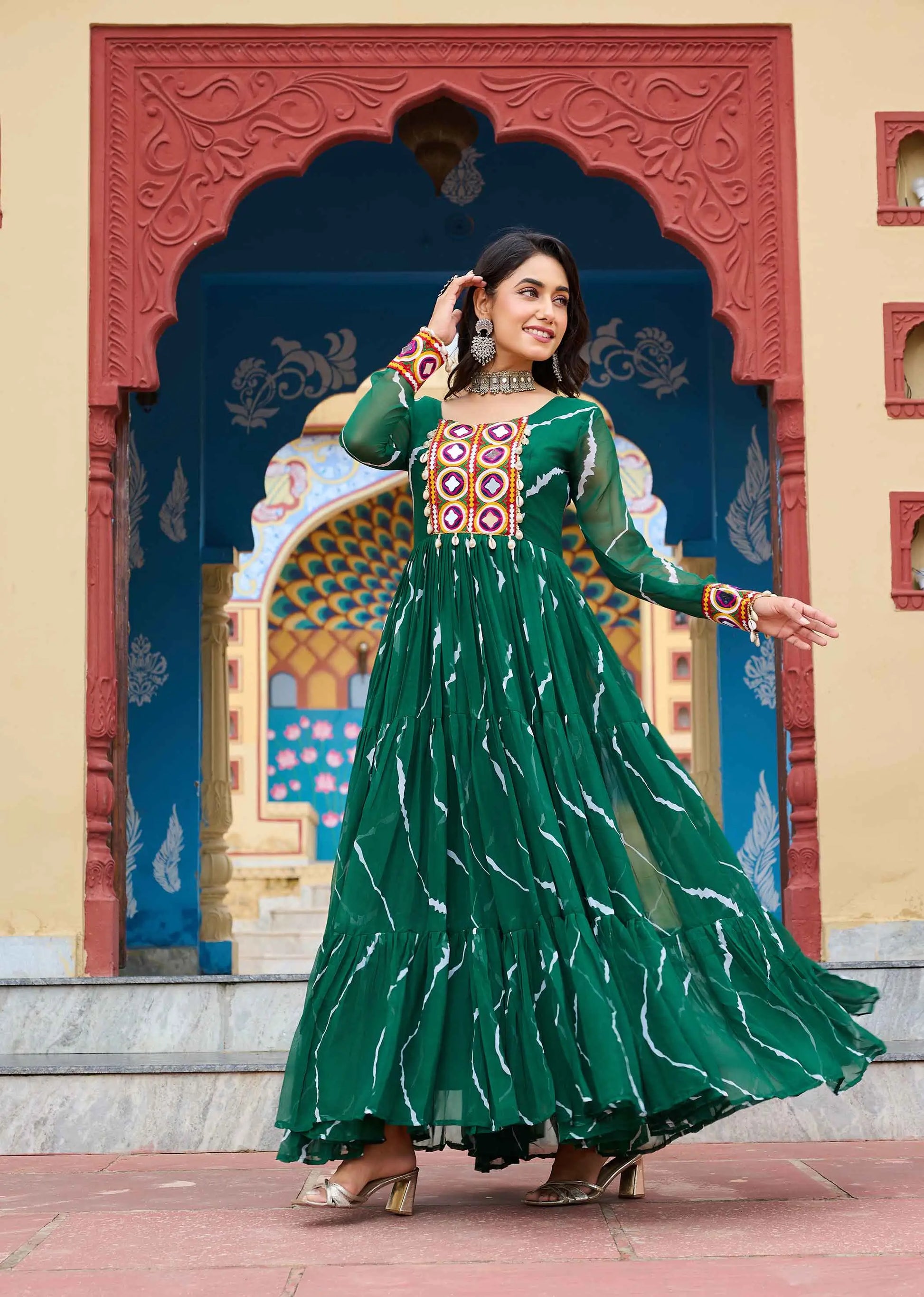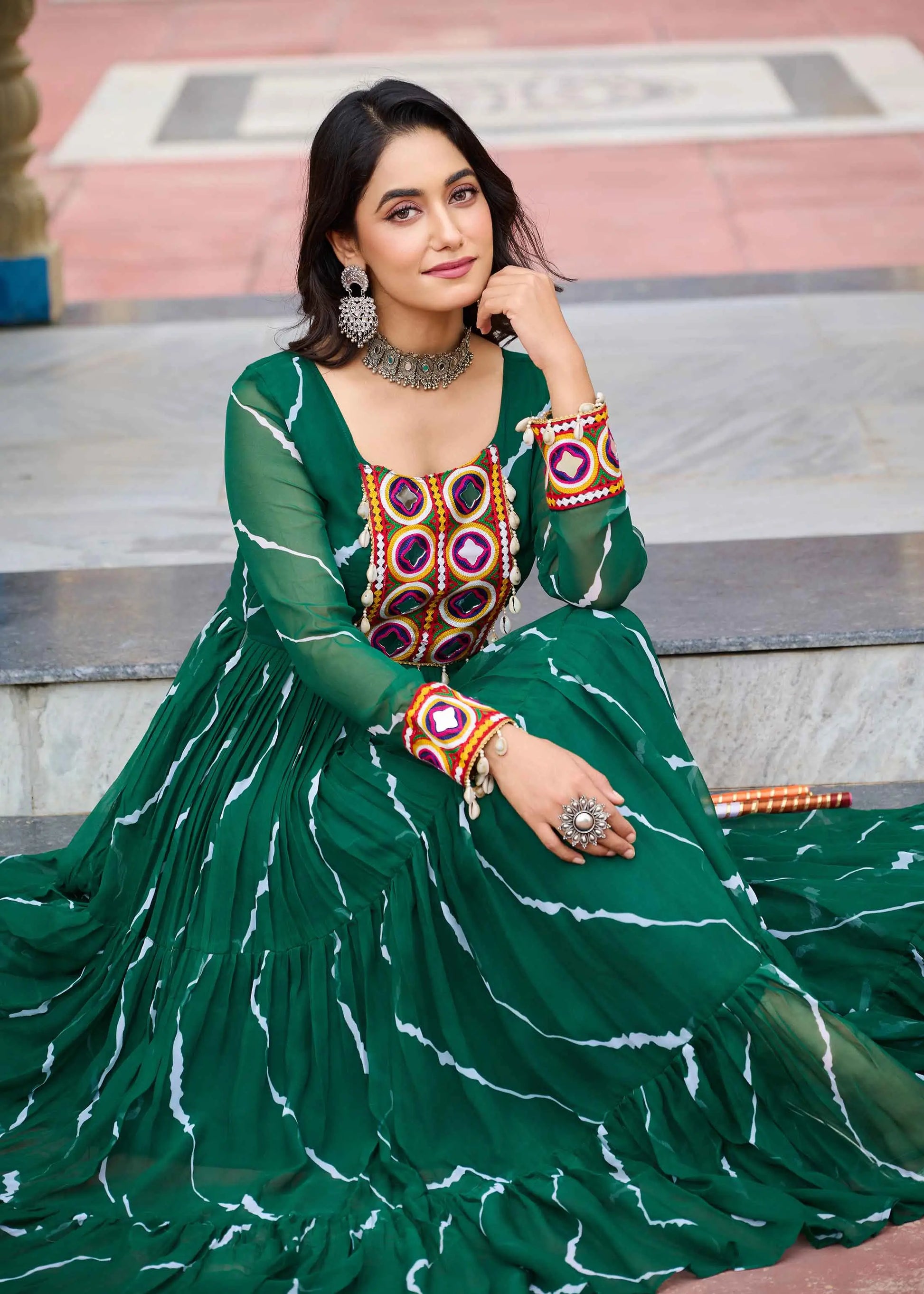 Dark Green Laheriya Print With Kutchi Patch Work Navratri Gown