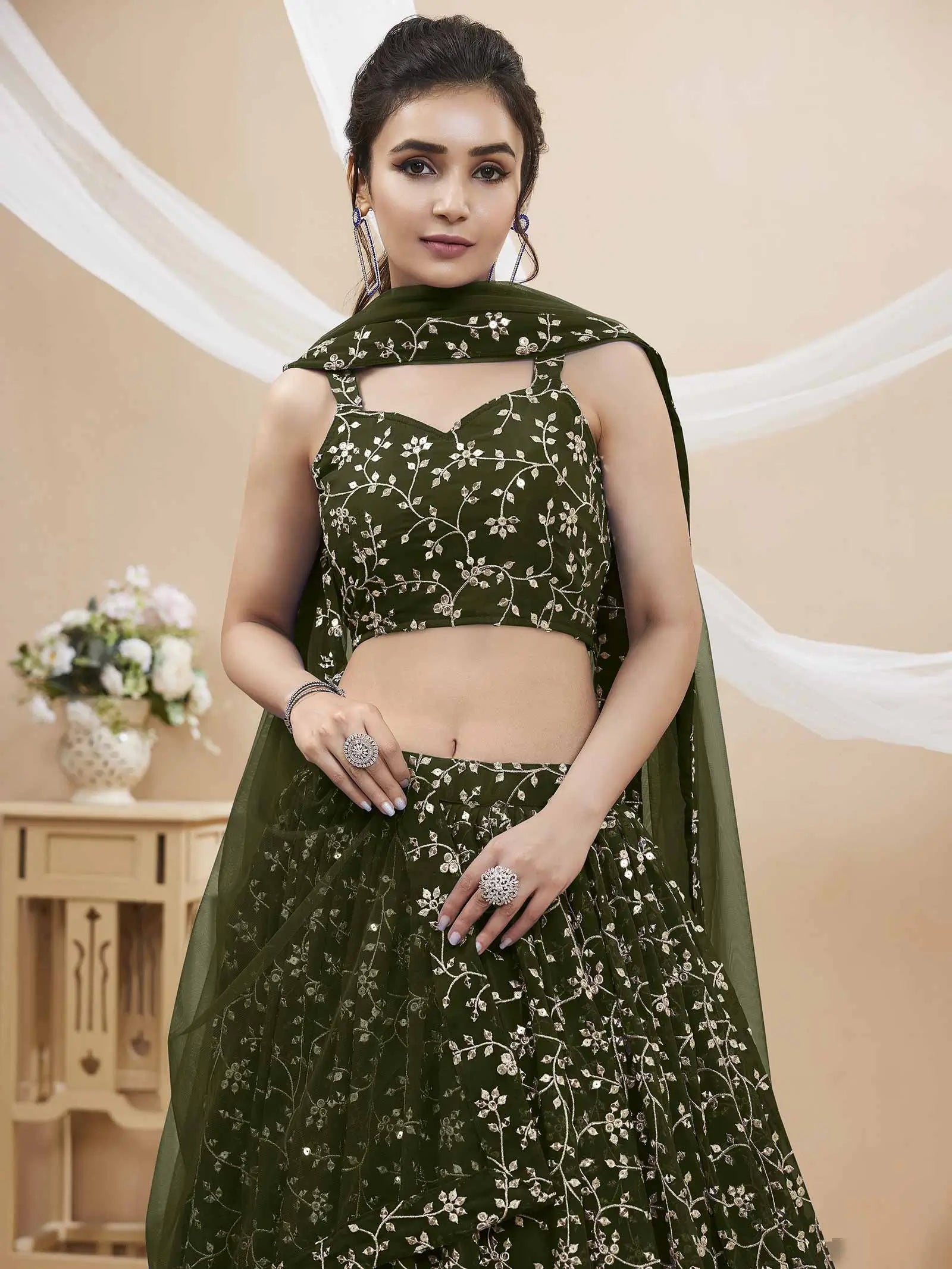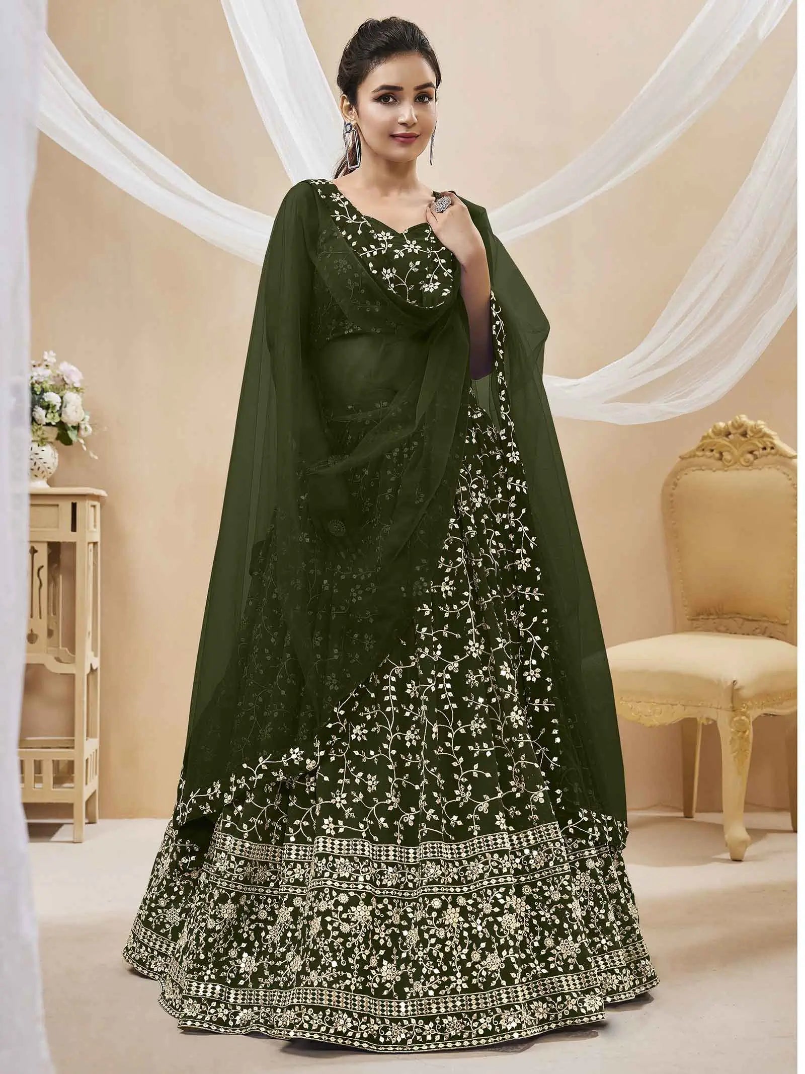 Dark Olive Green Georgette Lehenga With Sequins And Zari Embroidery Work