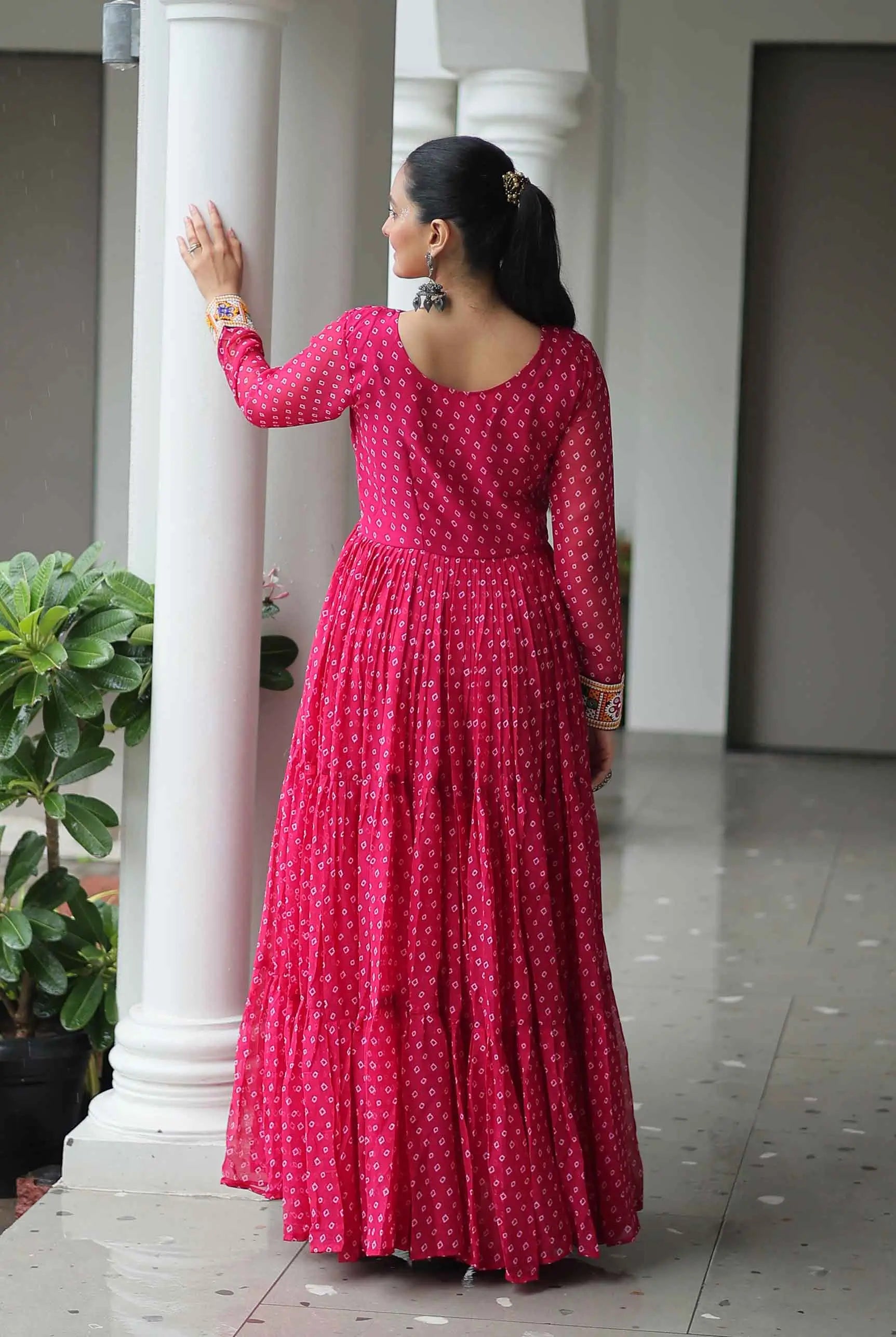 Dark Pink Navratri Gown Bandhani Print With Kutchi Patch Work