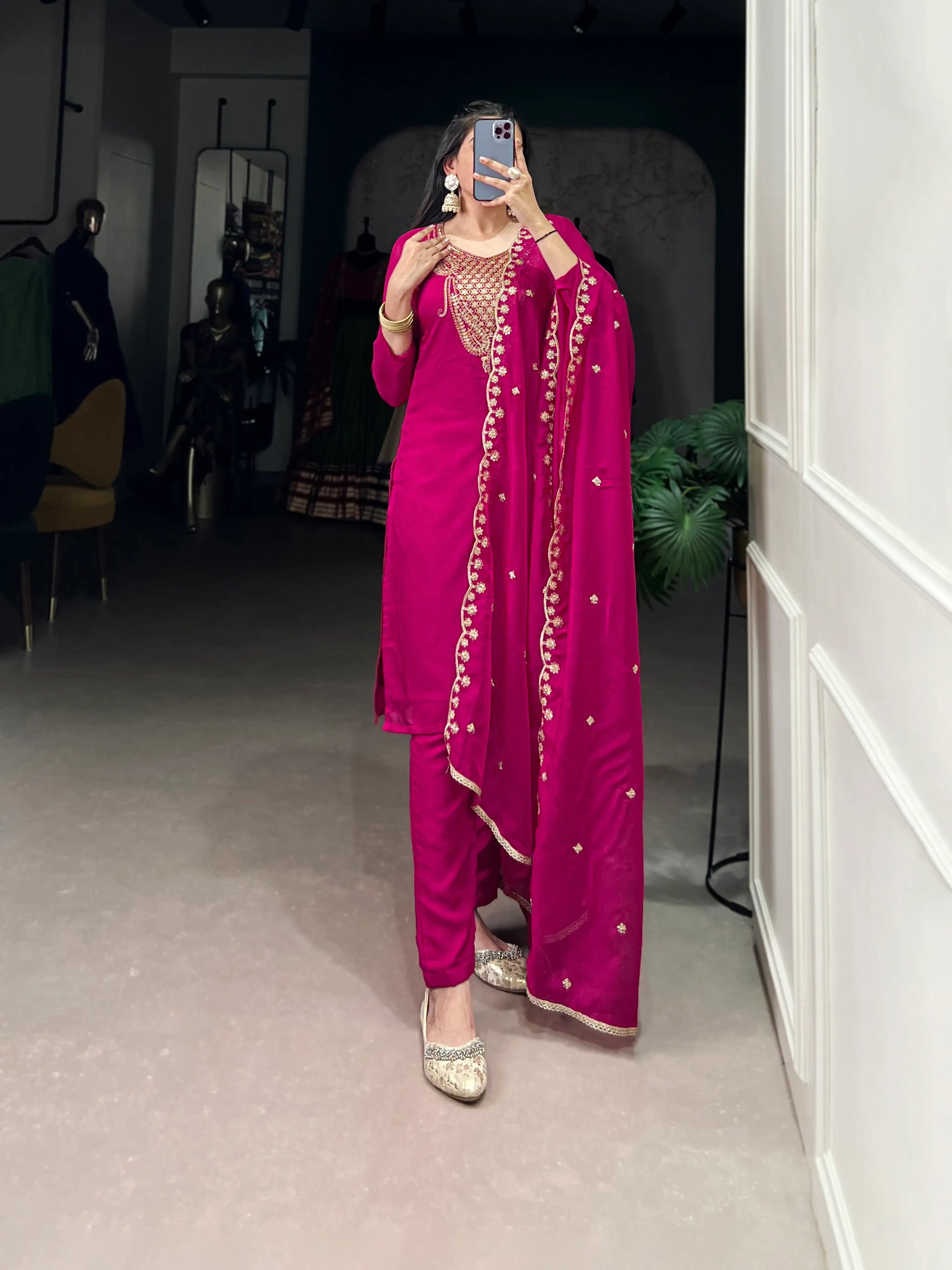 Dark Pink Organza Salwar Suit With Sequins & Thread Embroidery Work