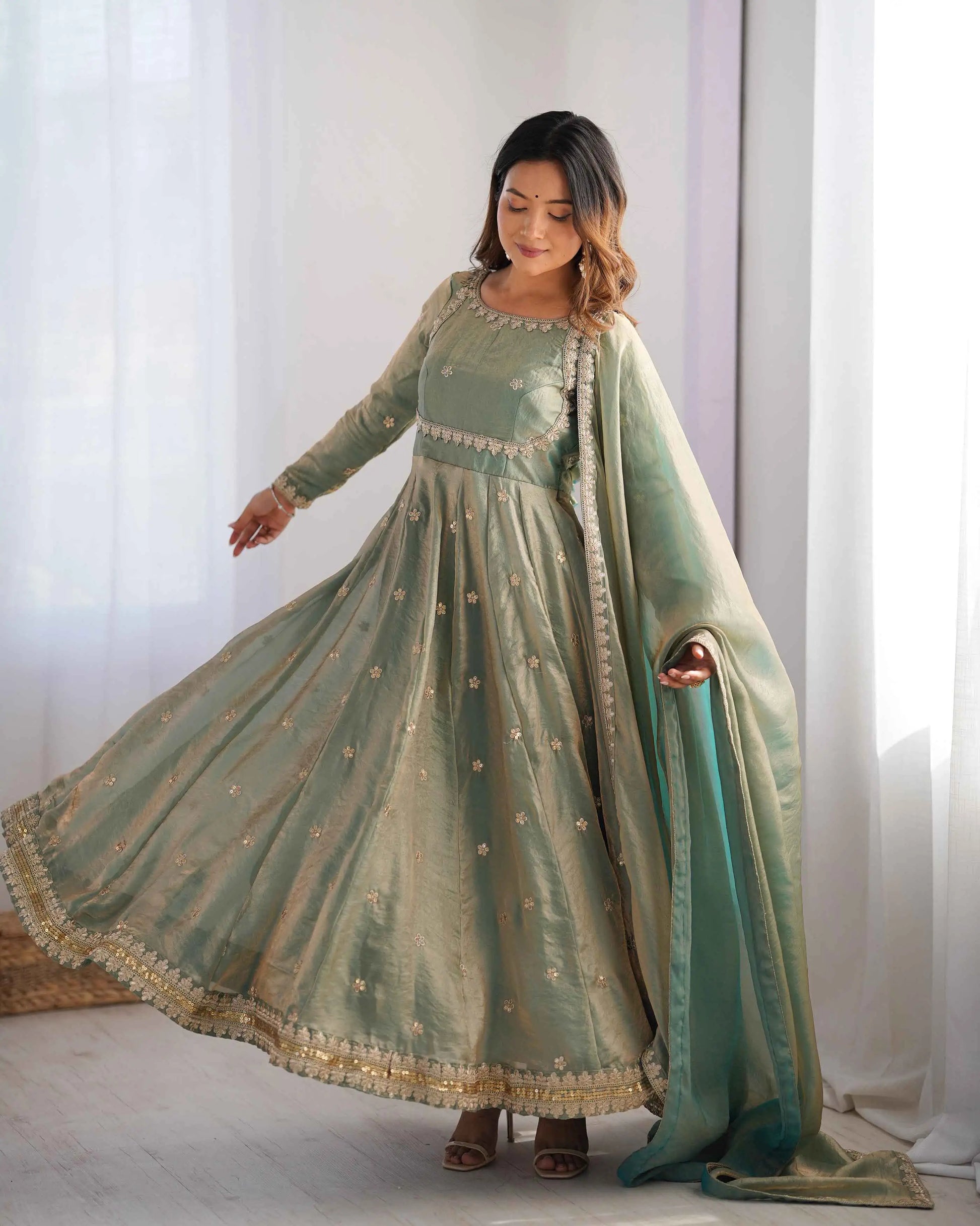 Designer Shiny Olive Green Cording Sequins Embroidery Work Gown With Dupatta