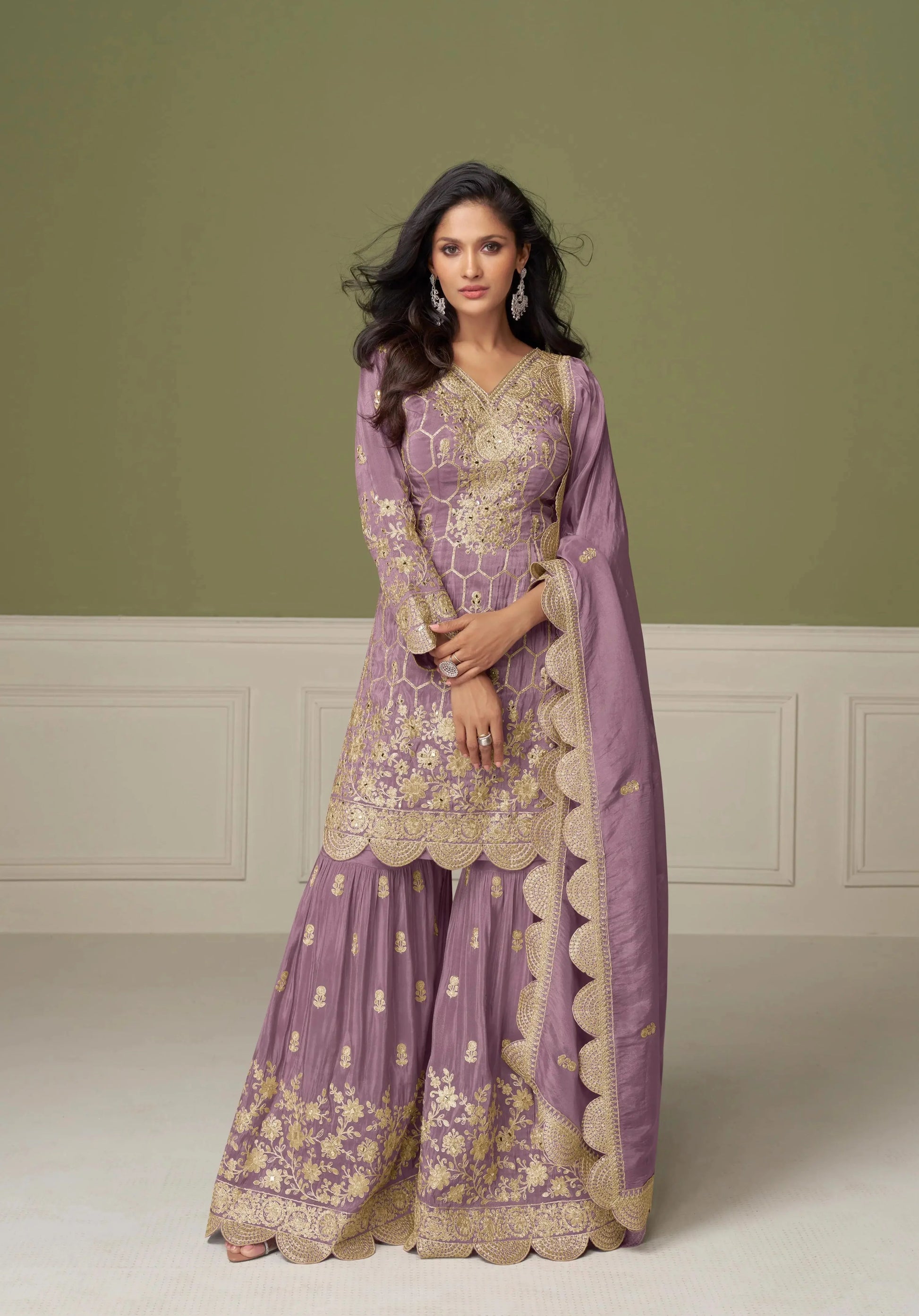 Dull Purple Shimmer Silk Sharara Suit With Mirror & Embroidery Work