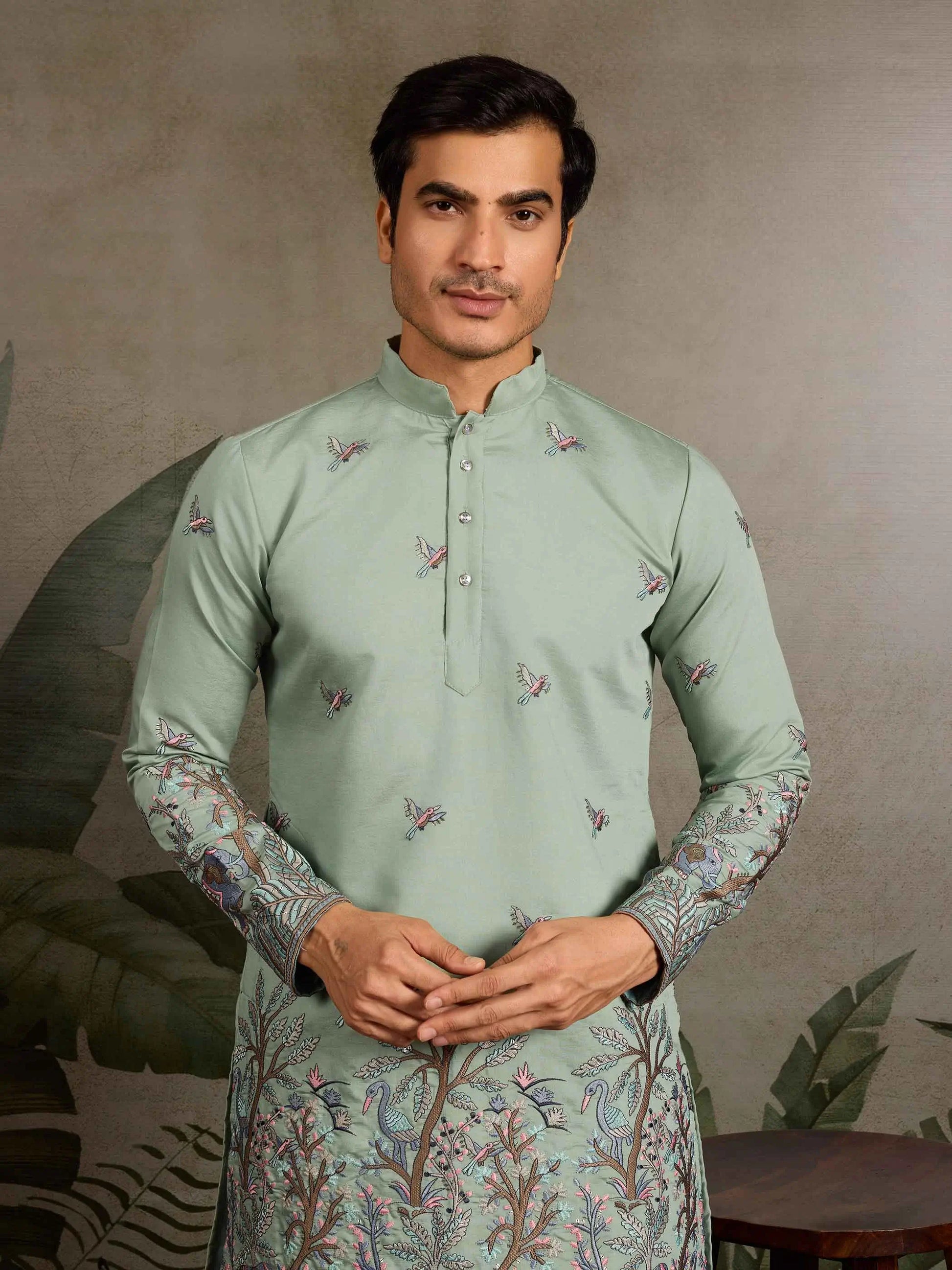Elegant Pista Kurta Set With Elephant Embroidery Work