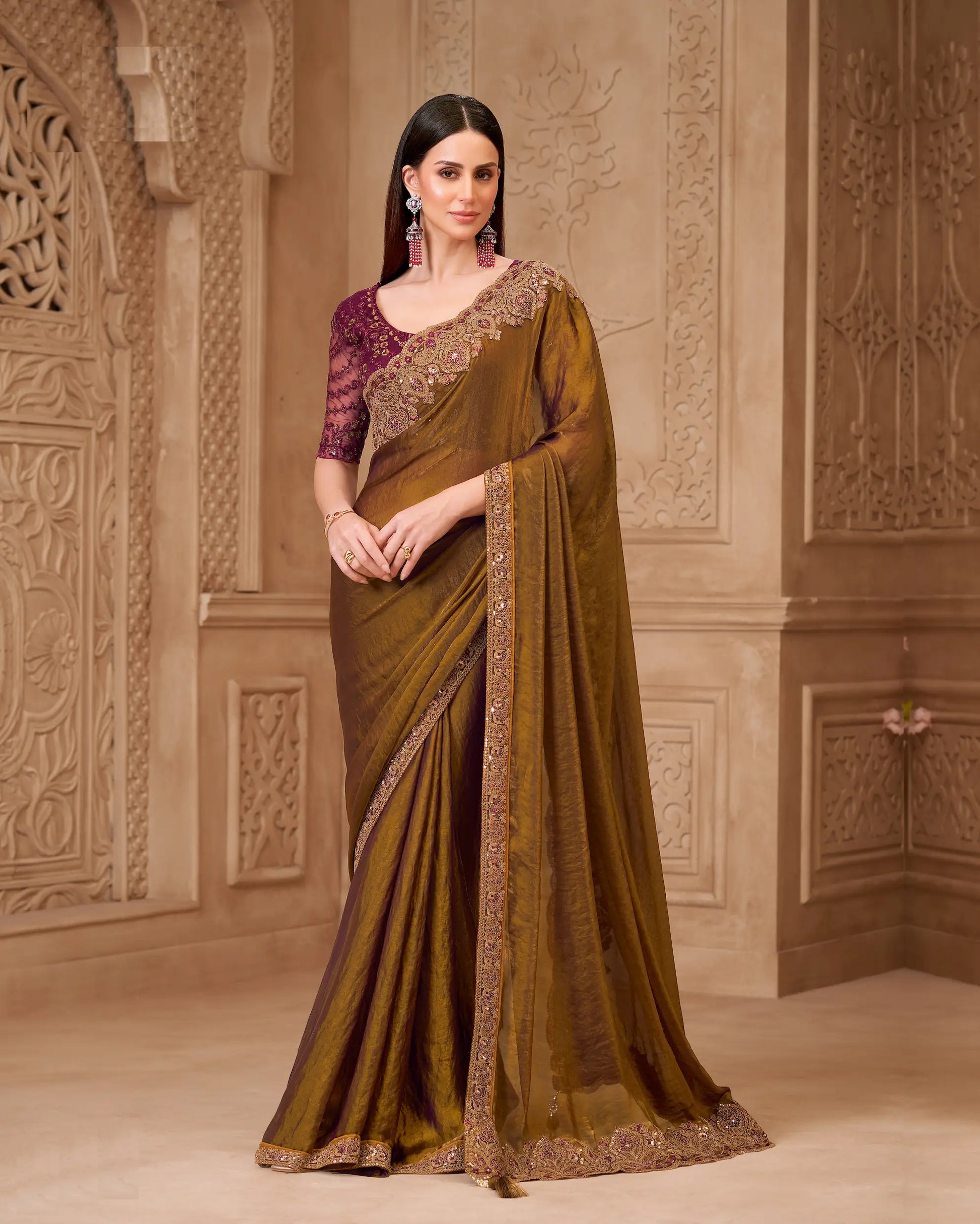 Golden brown Satin Georgette Embroidery Party Wear Saree