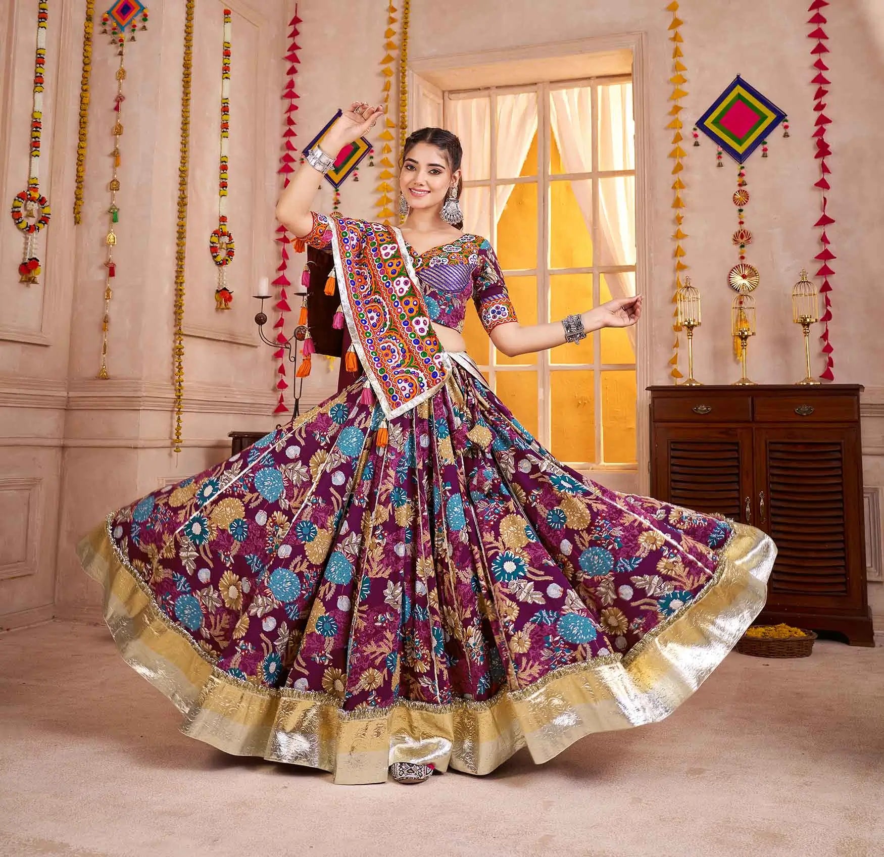Grape Purple Floral Print Lehenga With Kutchi Work Choli For Navratri
