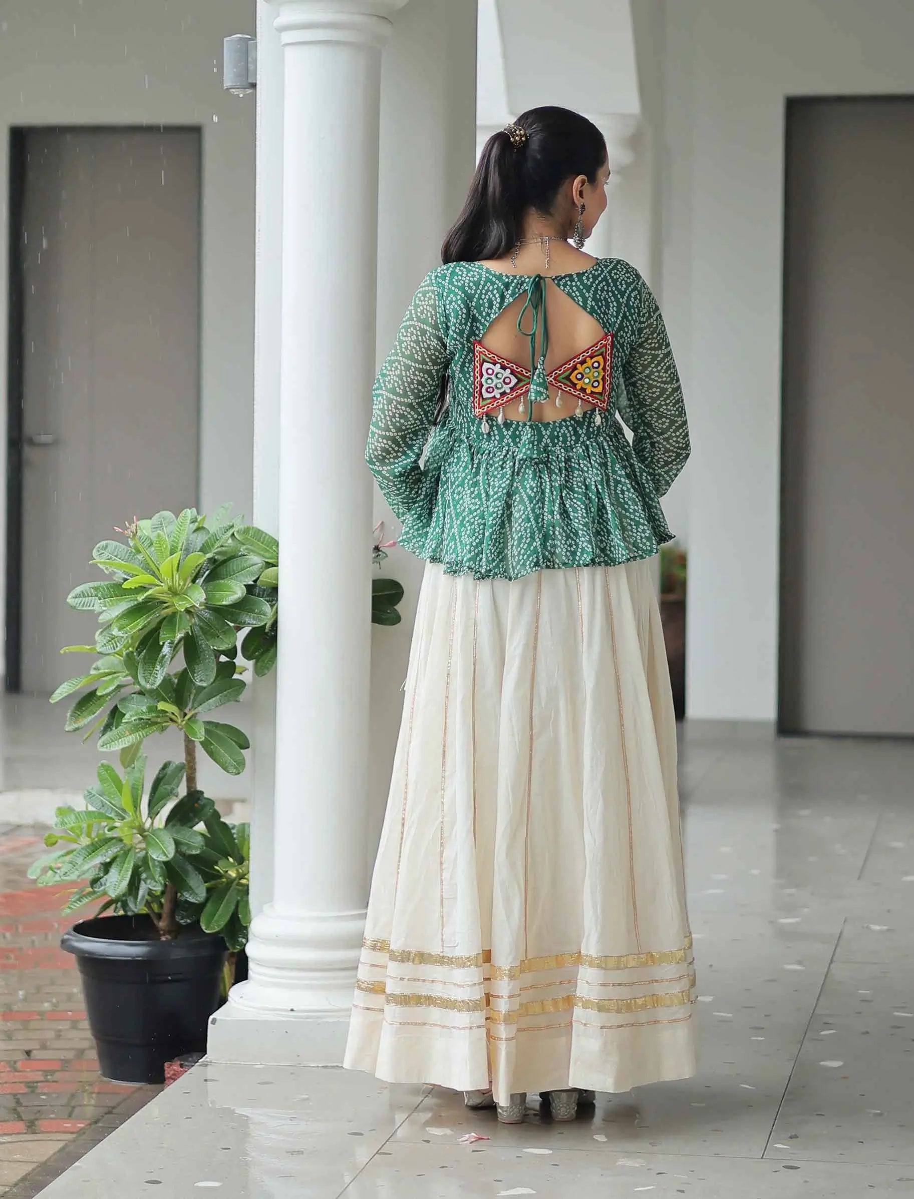 Green Bandhani Print And Gamtthi Patch Work Top With Lehenga For Navratri