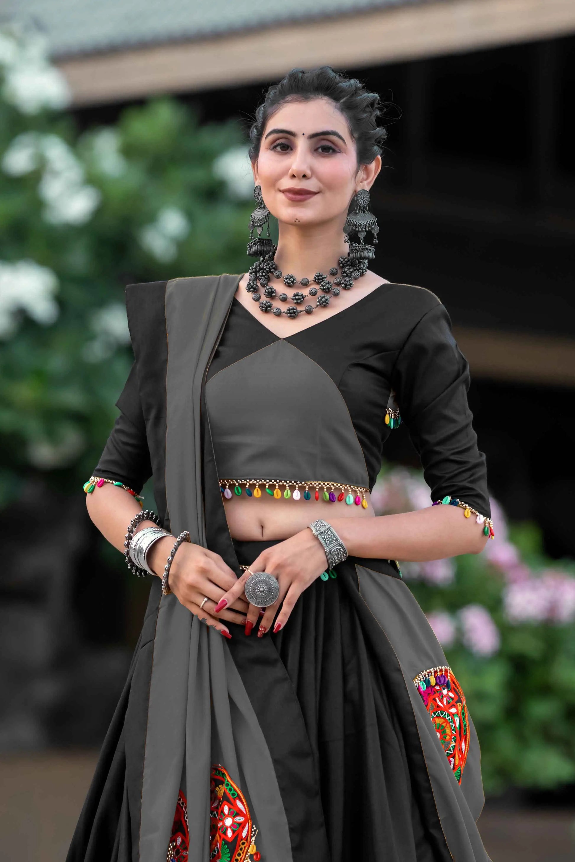 Grey And Black Gamthi Work Chaniya Choli For Navratri