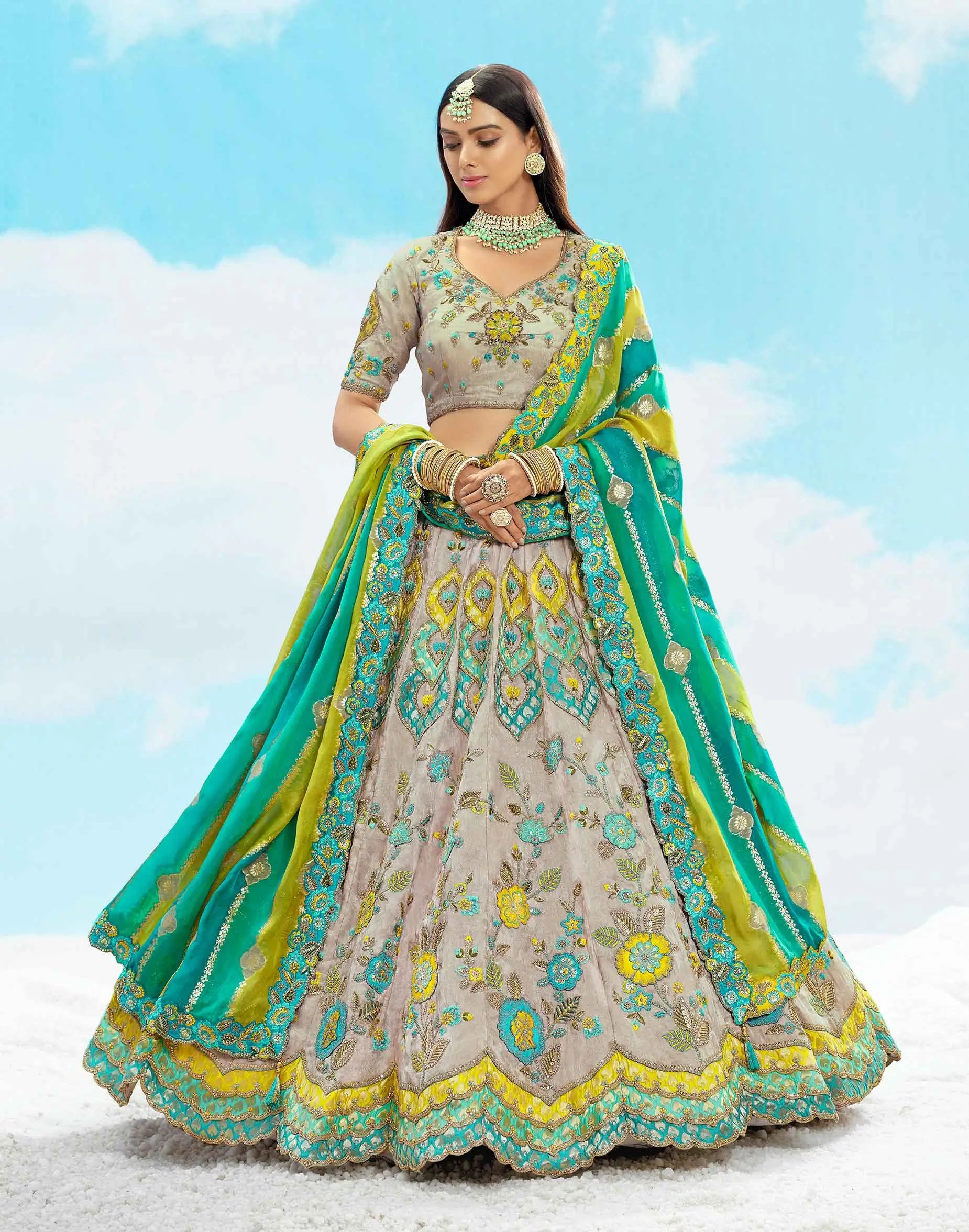 Grey And Teal Blue Designer Patch & Floral Embroidery Work Bridal Lehenga