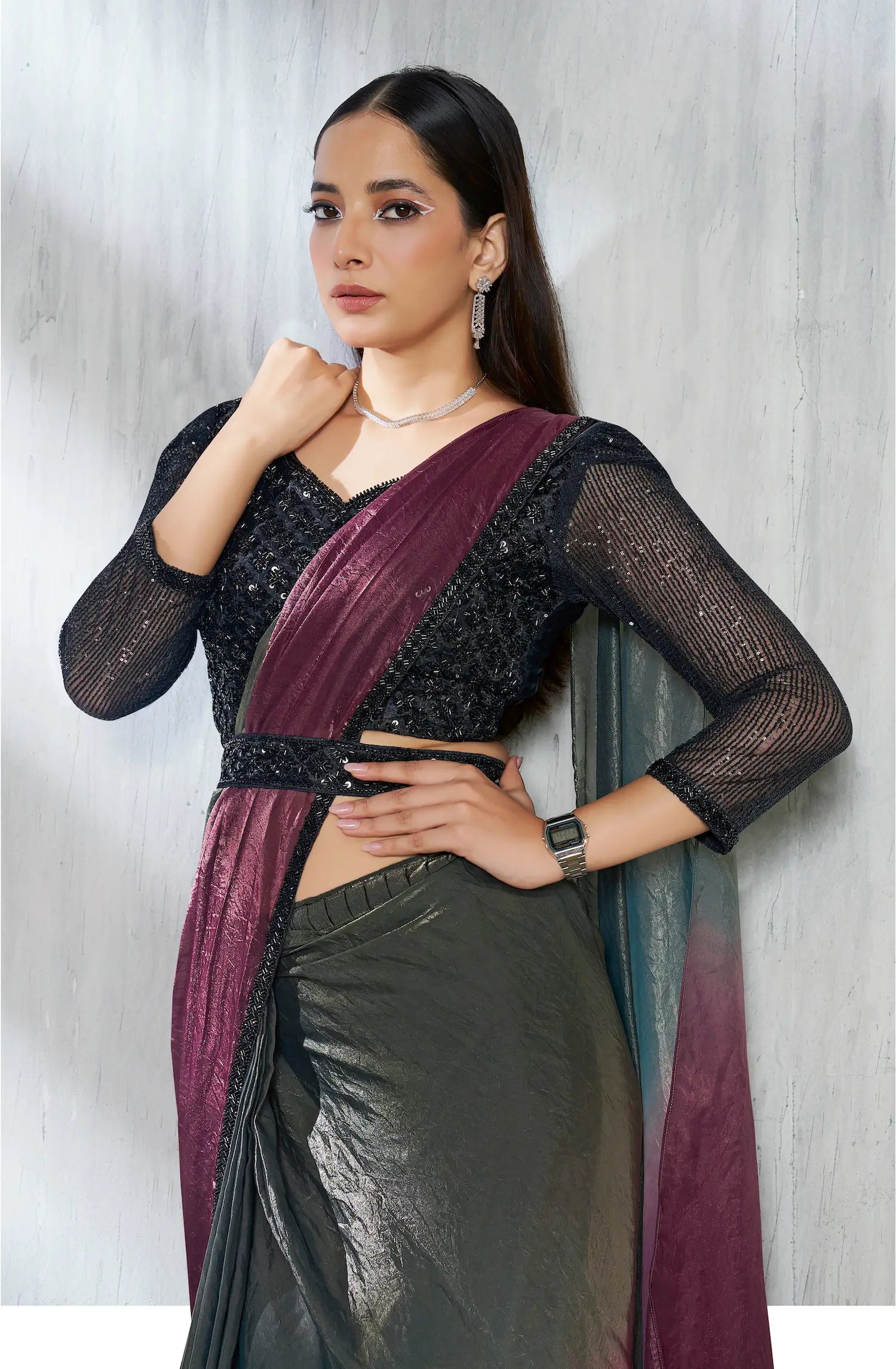 Effortlessly stylish, this grey-wine one-minute saree in two-tone satin silk with shaded print and beads embroidery. It pairs with organza blouse detailed in embroidery with fancy sleeves, finished with an embellished belt for a refined look.