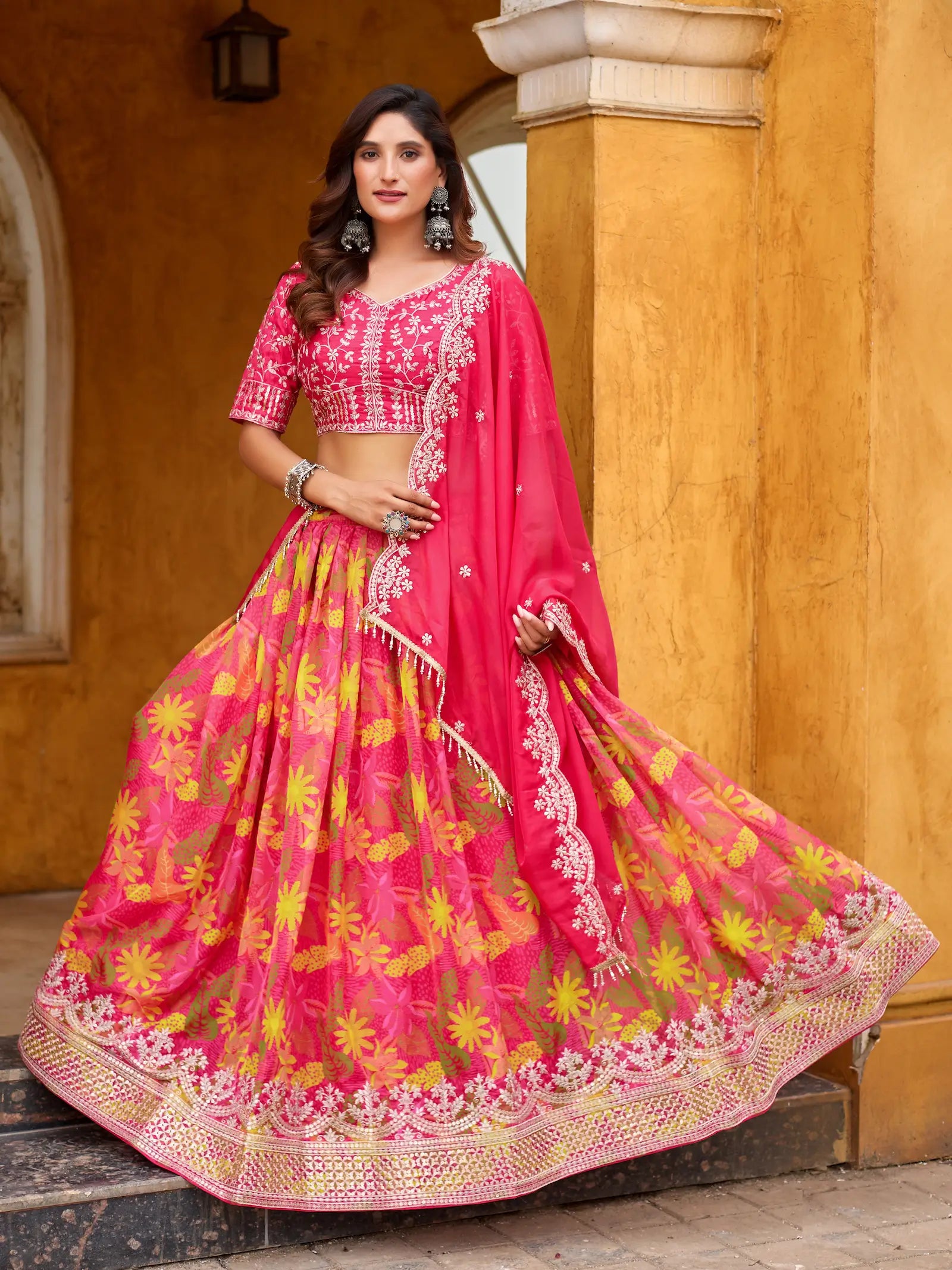 This hot pink taby silk lehenga with floral print, thread, and sequins embroidery work. Paired with art silk blouse and a taby silk dupatta with thread and sequins detailing, Perfect for weddings or festive occasions.