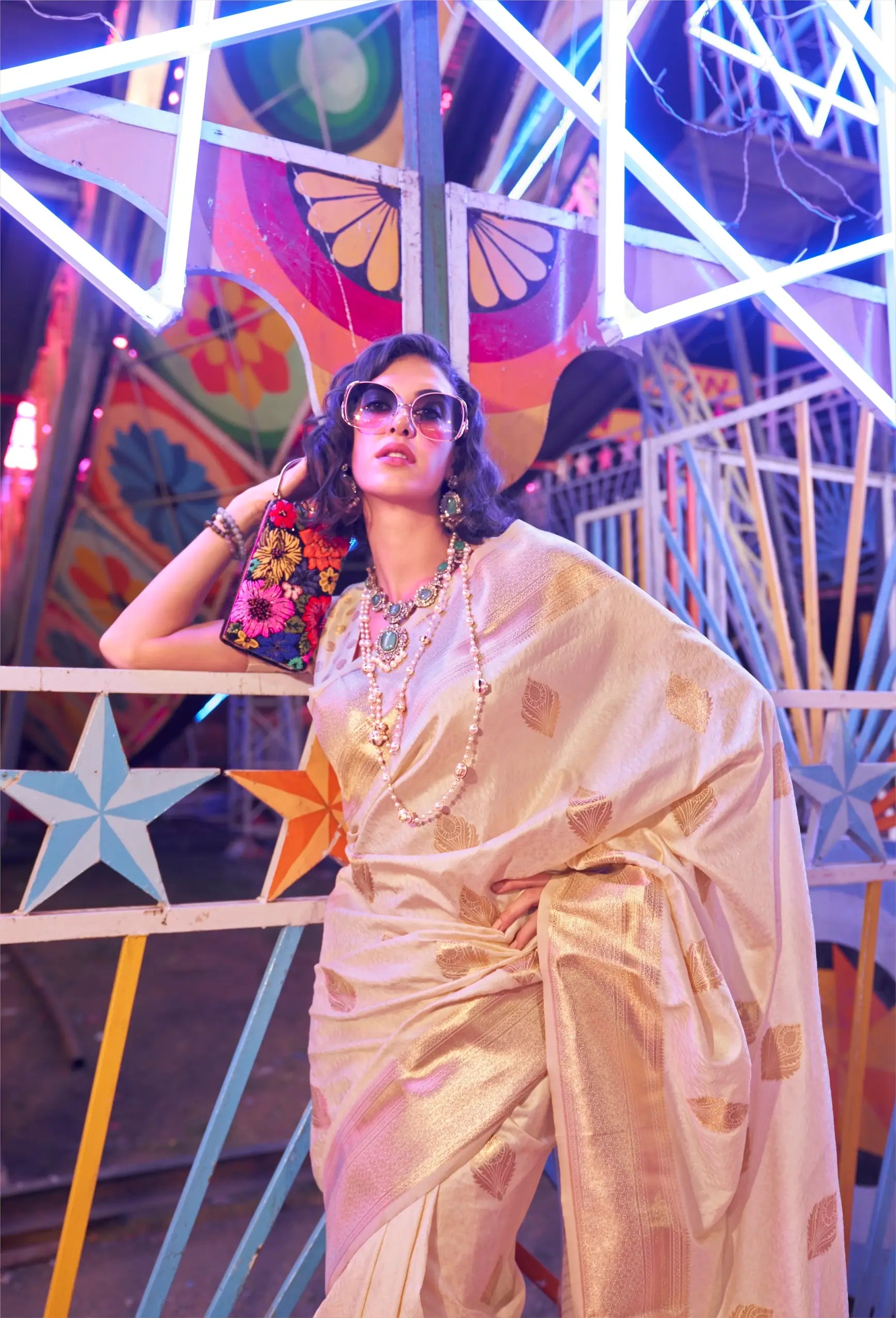 Ivory Handloom Weaving Silk Saree With Handwoven Art