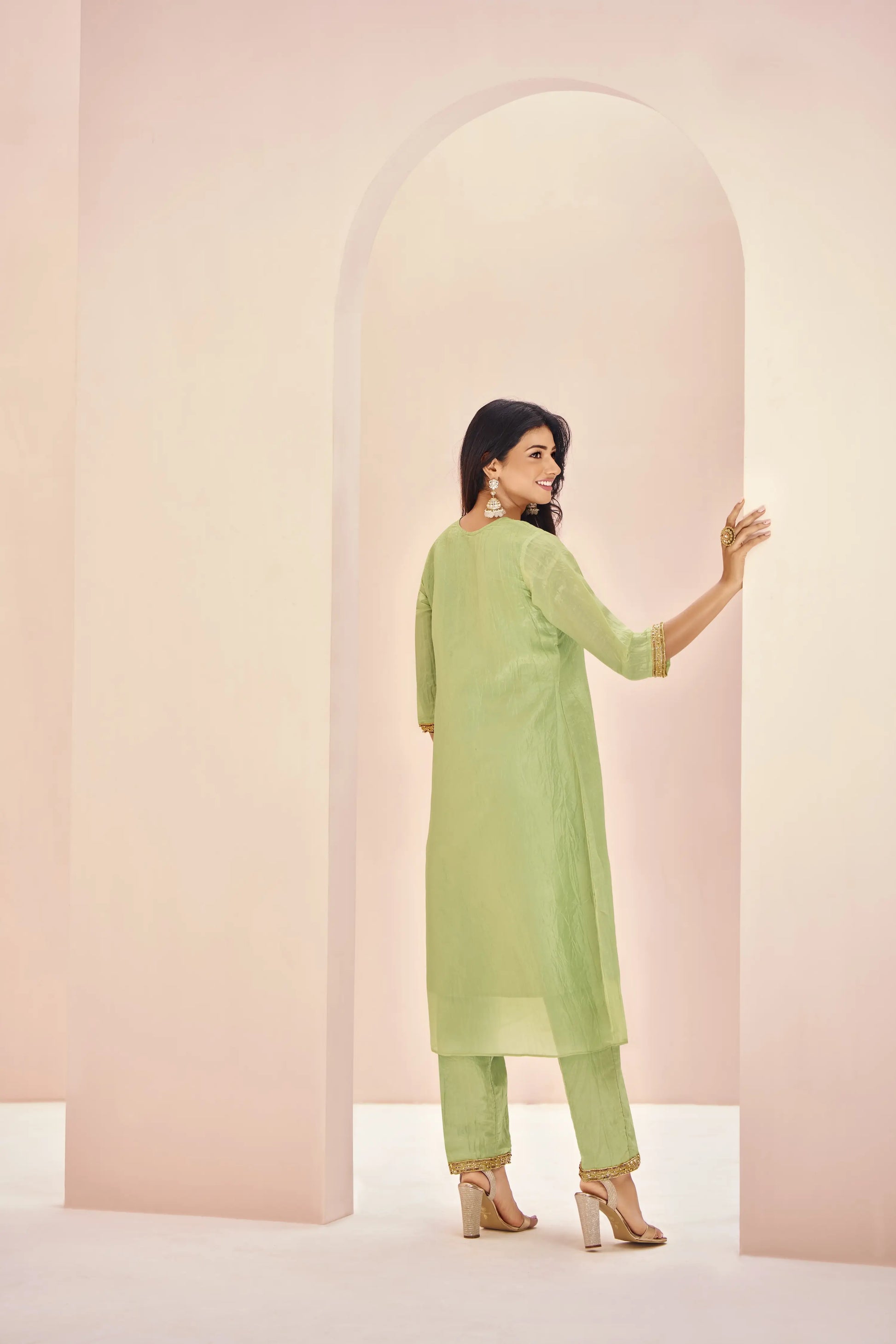 Celebrate the upcoming wedding season with this beautiful Pure Blooming Light Green Organza Fabric Straight Fit Kurta Set. The set includes a stylish kurta with matching trouser. Ready to wear, it’s the perfect choice for festive occasions, offering both elegance and comfort.