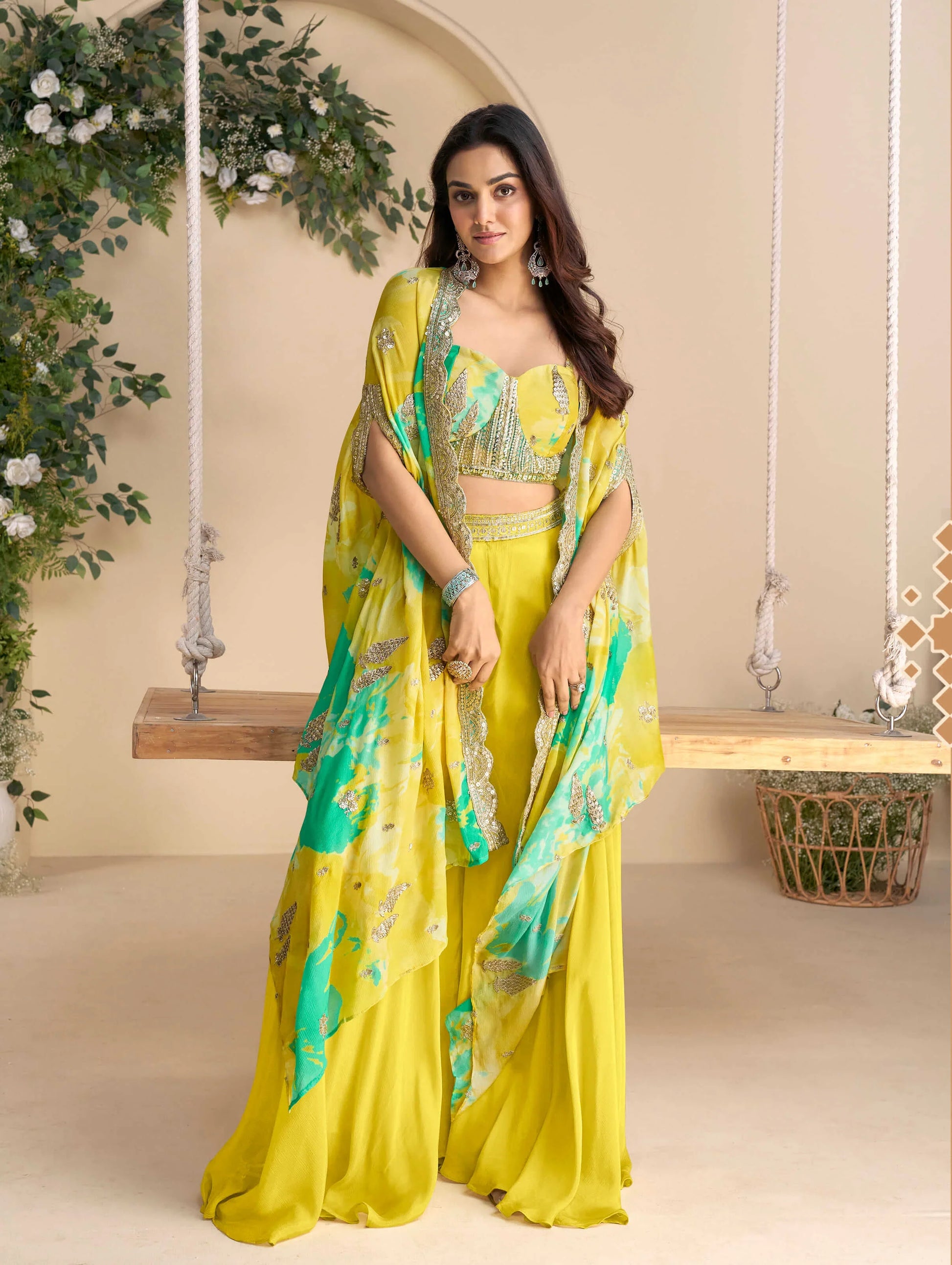 Lime Yellow Embroidered Indo Western Set