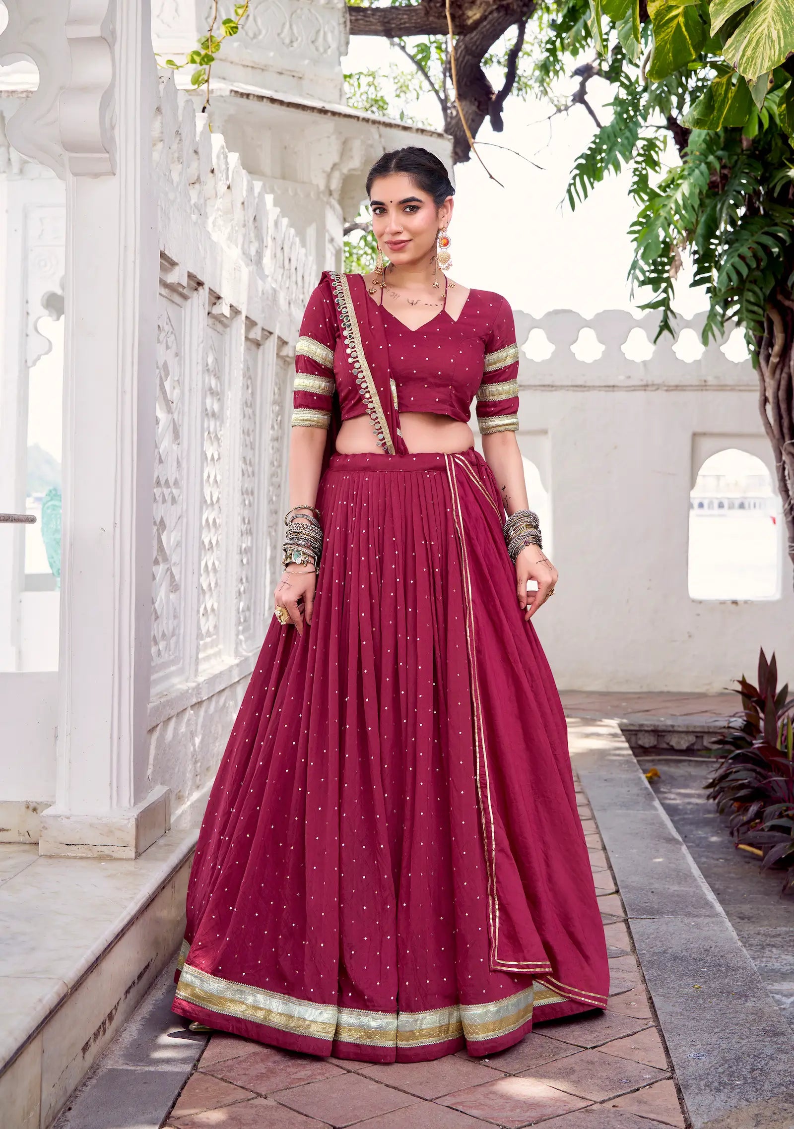Gracefully traditional, this maroon chanderi silk lehenga features exquisite zari weaving and embossed design lace touch-up. The coordinated blouse and dupatta complete the regal look, perfect for festive and cultural celebrations.