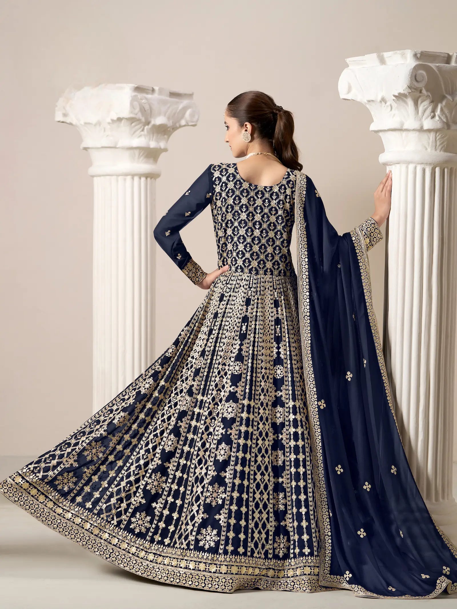 Navy Blue Georgette Gown With Sequence & Thread Embroidery Work