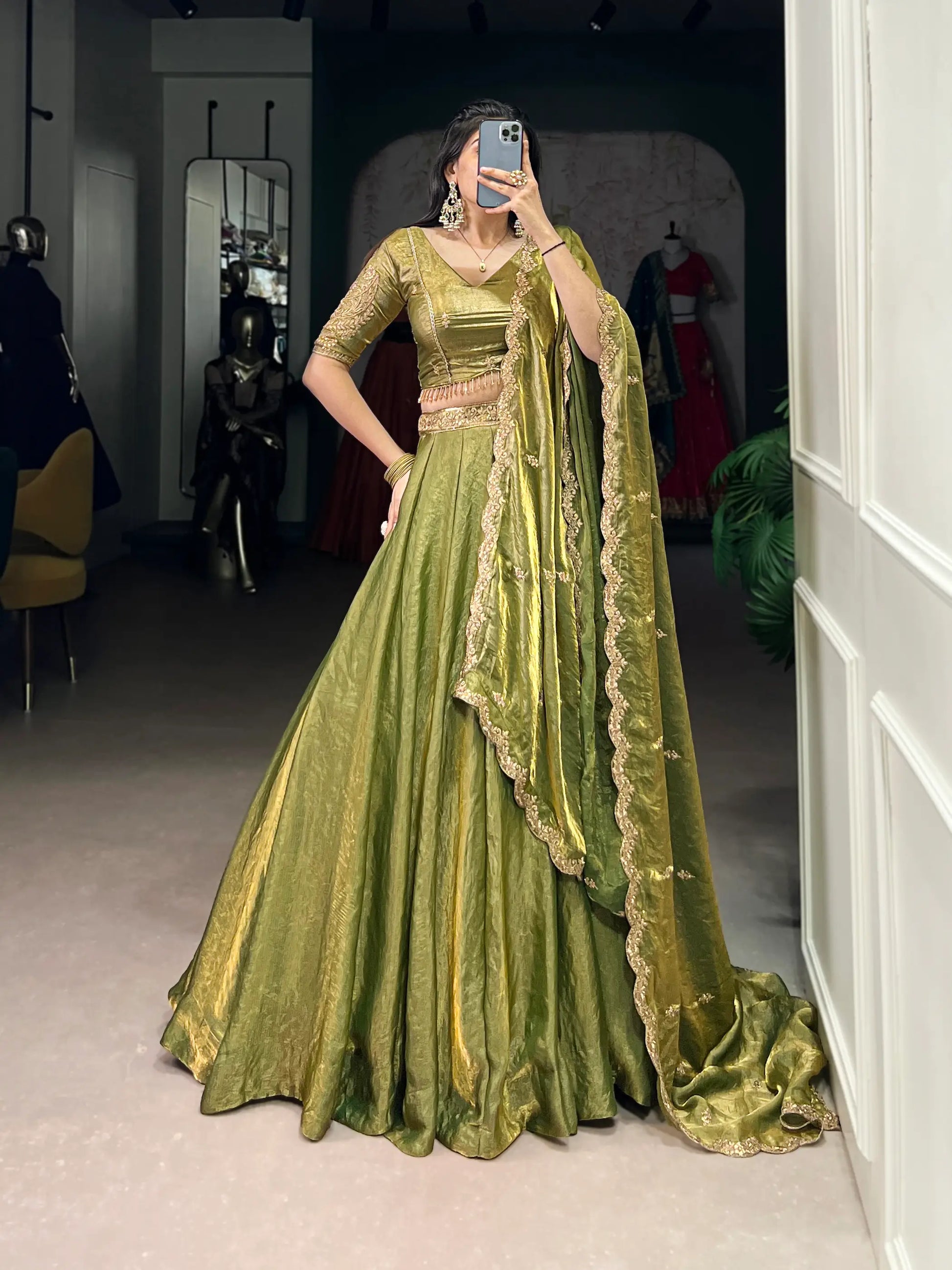 Olive Green Fendi Silk Sequins Embroidery Lehenga Choli