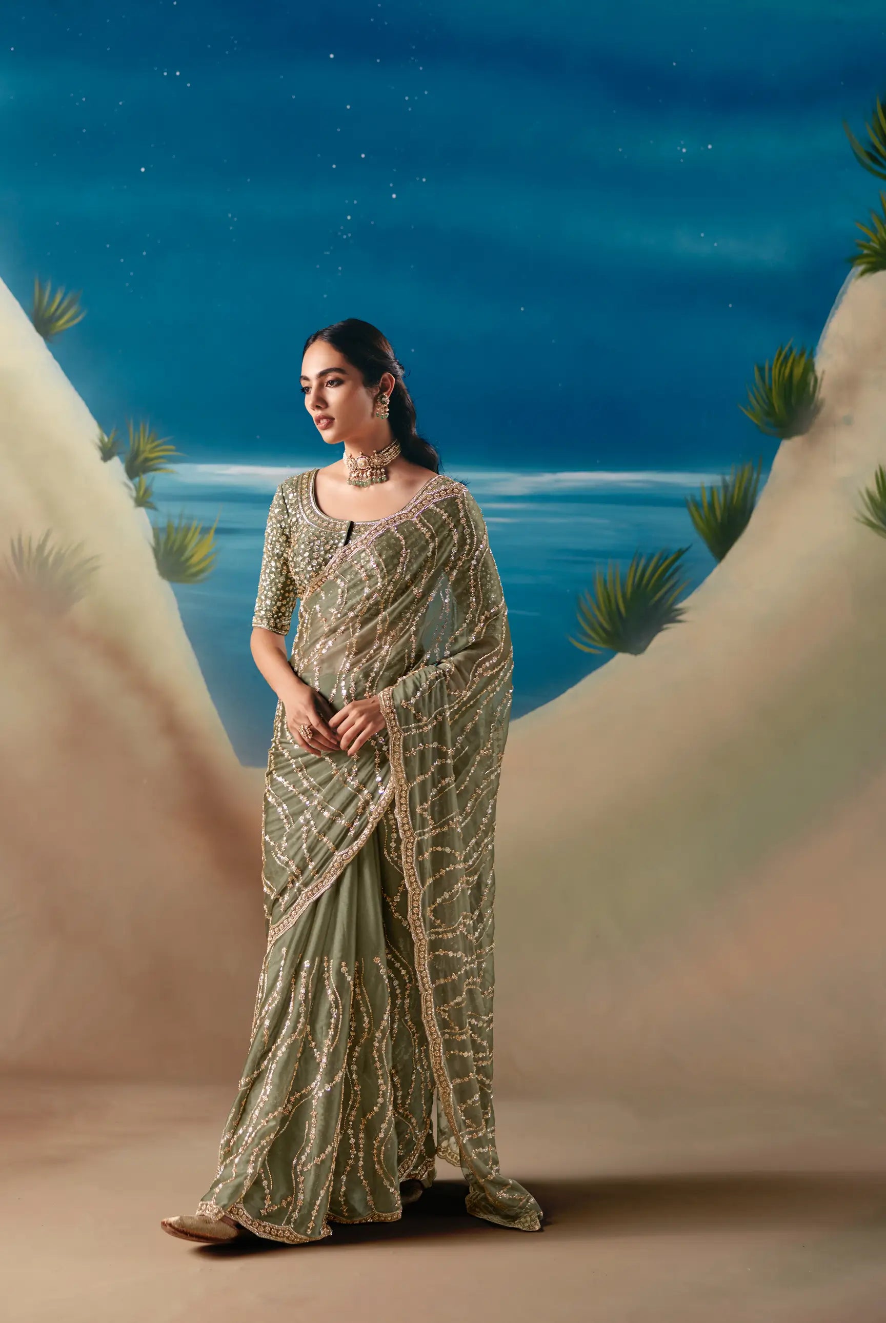 A luxurious olive green satin organza saree adorned with multi-sequins and bead heavy designer embroidery, paired with a matching blouse for a rich and graceful look.